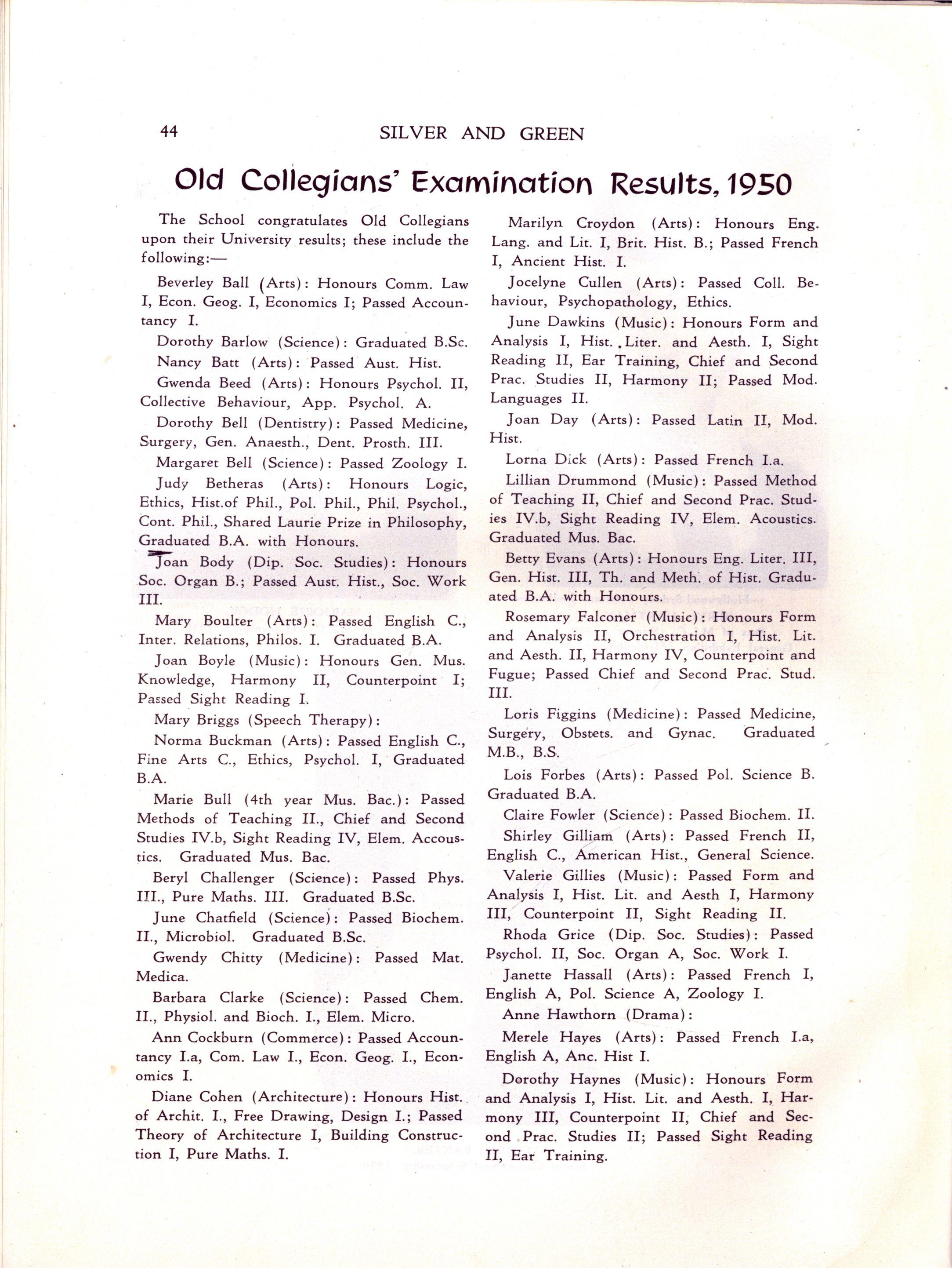 Marjorie Hodge, Associate Prefect, Dux of College (Humanities) 1950, Secondary Studentship, Queen's College Exhibition