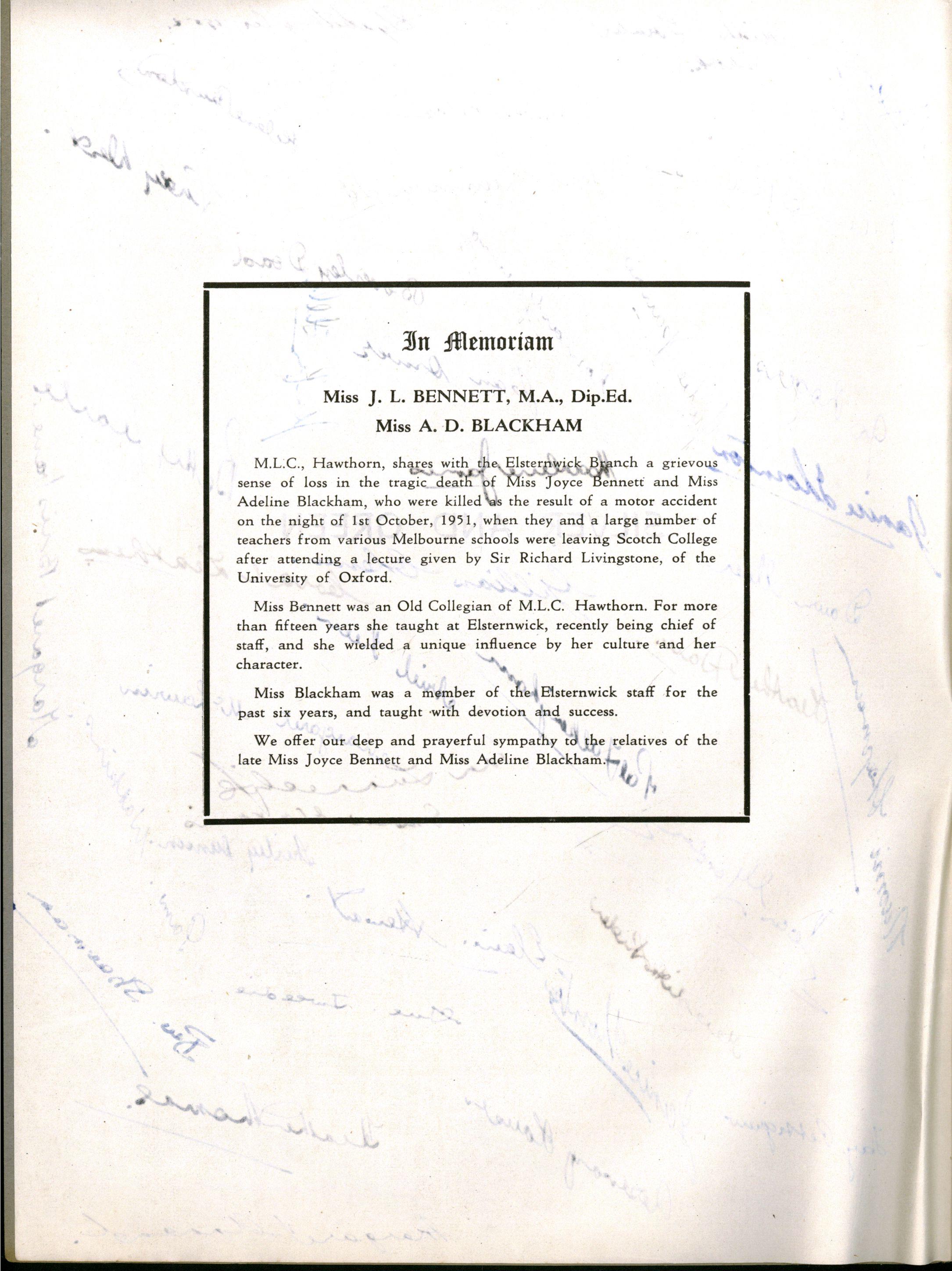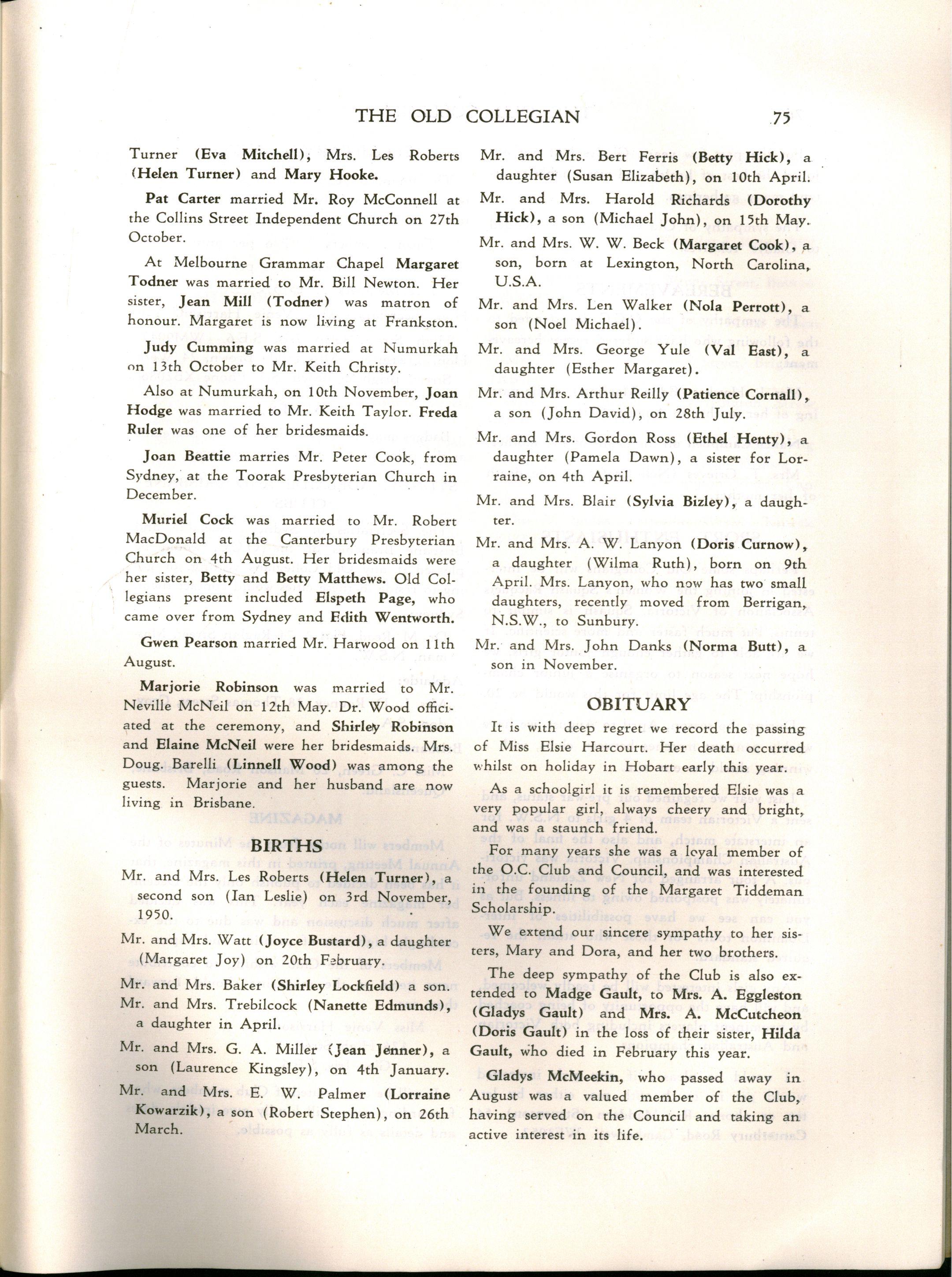 It is with deep regret we record the passing of Miss Elsie Harcourt. Her death occurred whilst on holiday in Hobart early this year