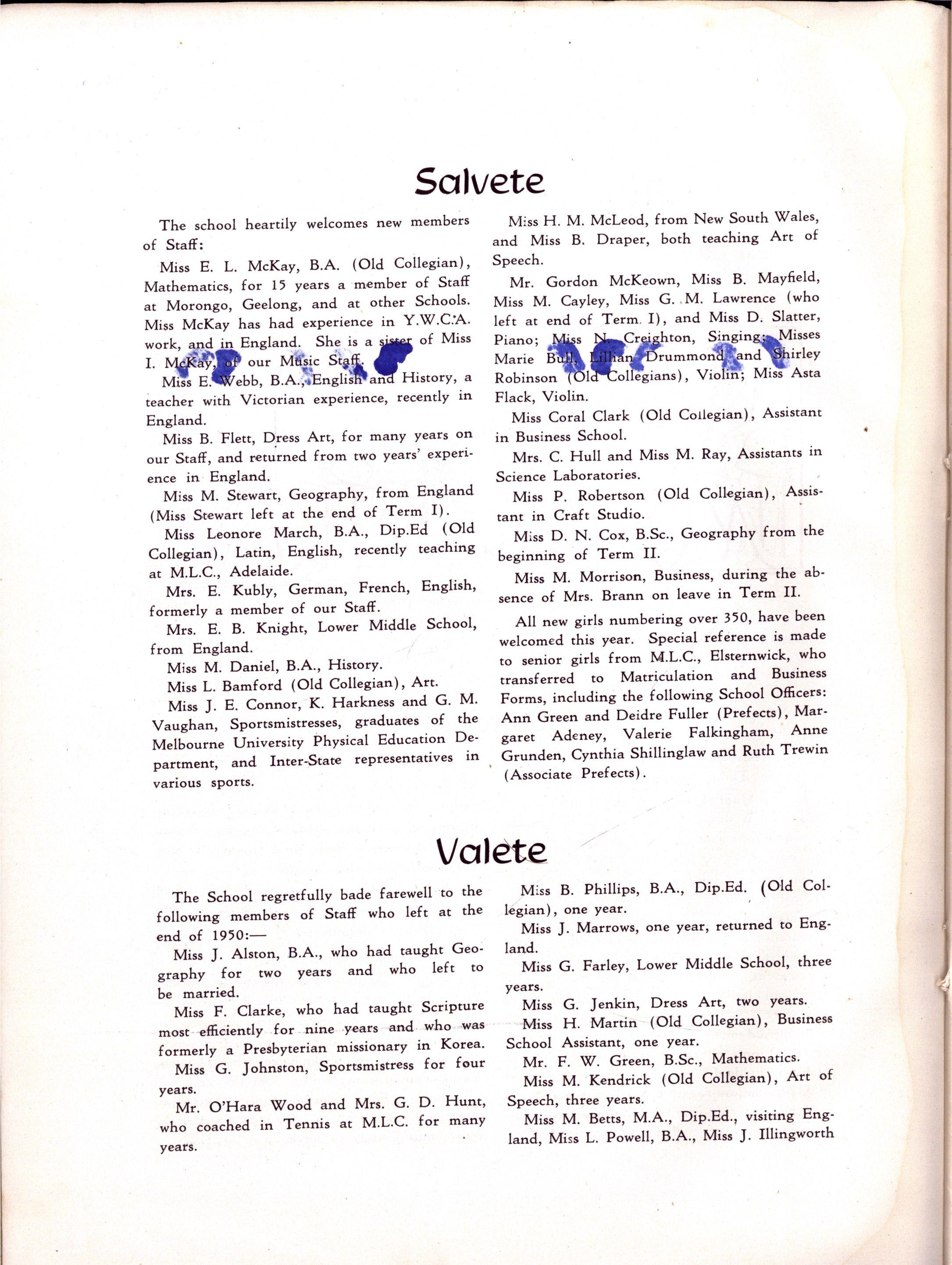 The School regretfully bade farewell to the following members of Staff who left at the end of 1950:—