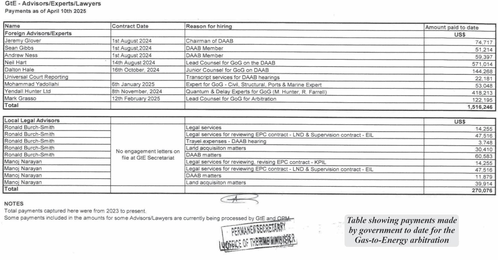Meanwhile, the foreign advisors/ experts include Jeremy Glover, Sean Gibbs, Andrew Ness, Neil Hart, Dalton Hale, Mohammad Yadollahi, Yendall Hunter Ltd. and Mark Grasso along with Universal Court Reporting The foreign experts were paid a total of US$1,516,246, while the local legal advisors have been paid the sum of US$270,076 to date since 2023.