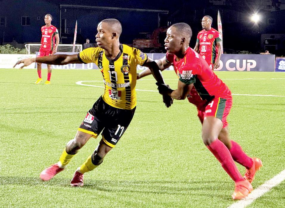 Action between Western Tigers and Monedderlust FC in the GFF Elite League.