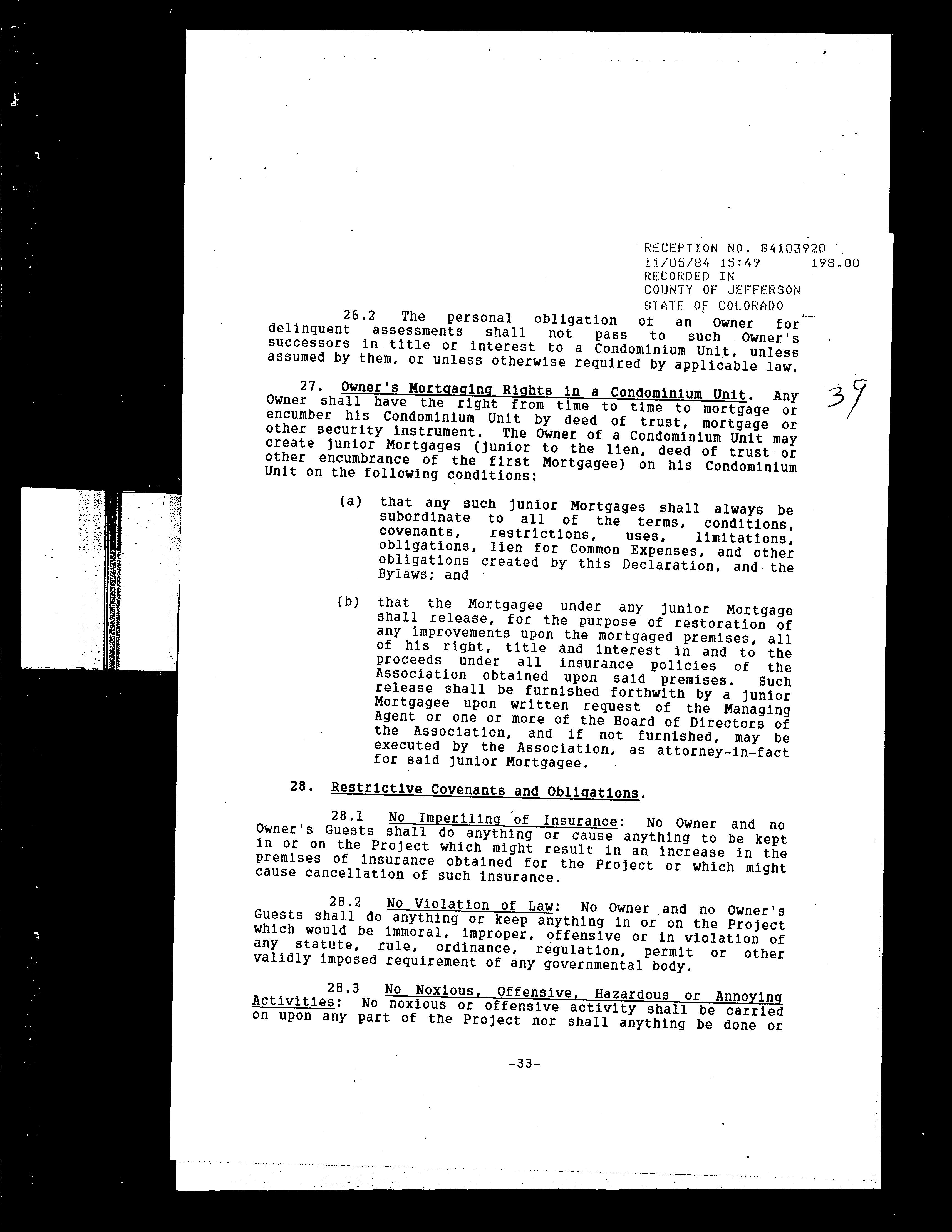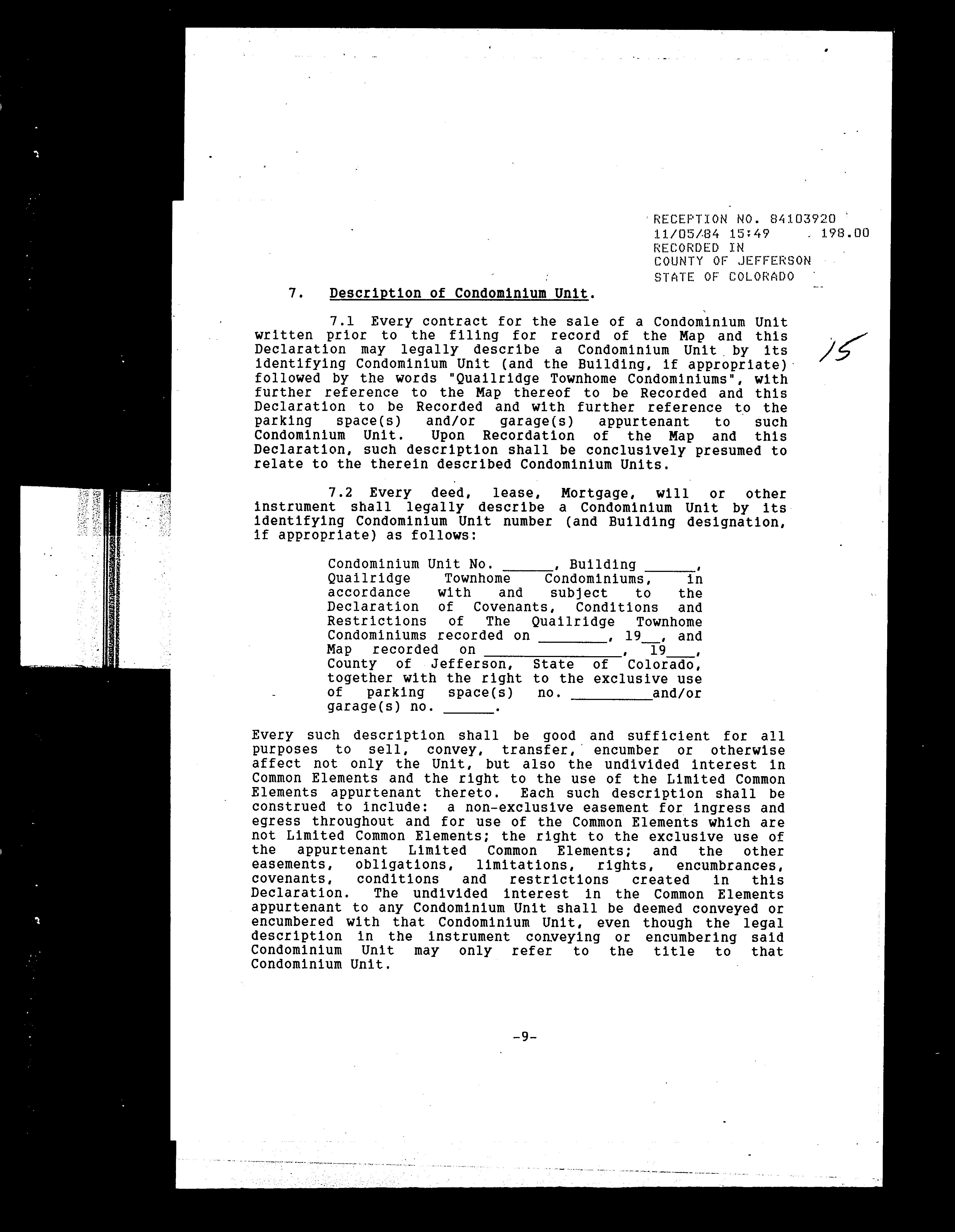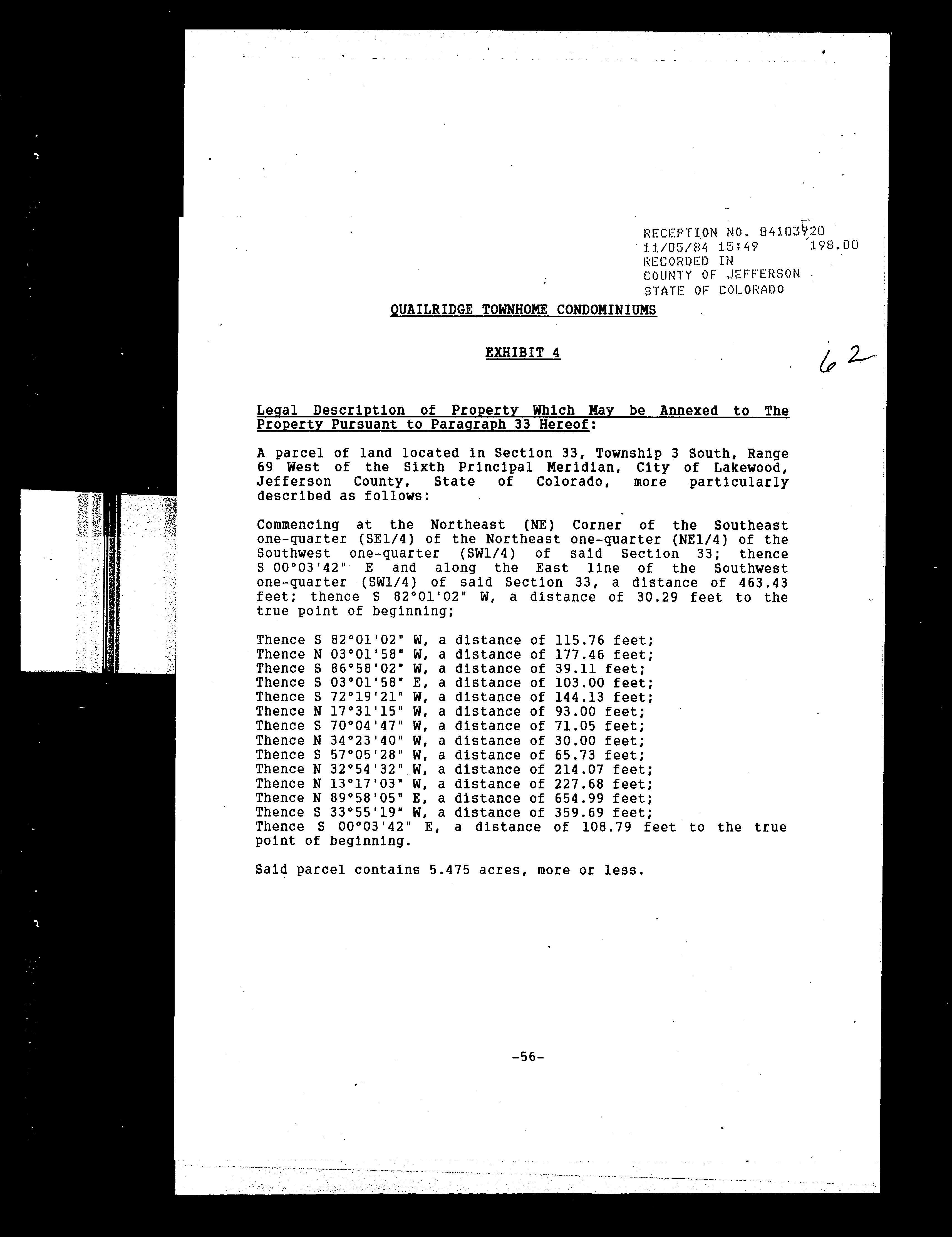 Legal Description : Section 33 Township 03 Range 69 Qtr Sw Subdivisioncd 617800 Subdivisionname Quailridge Townhome Condos Ph Iii 2nd Supp Block 001 Lot 0105 Tract