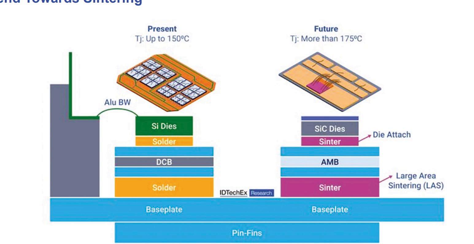 bondline thicknesses ranging from 50-100µm for the former and 100150µm for the latter. Despite their satisfactory performance, IDTechX has observed a growing preference for Ag sintering, led by major automotive OEMs such as Tesla. Ag sintering, in comparison to traditional solder alloys, offers superior thermal and electrical conductivity and enhanced bond strength among other benefits. However, due to its higher costs and processing times, Ag sintering is likely to see primary adoption in applications that really require its benefits, such as wide bandgap-based inverters.