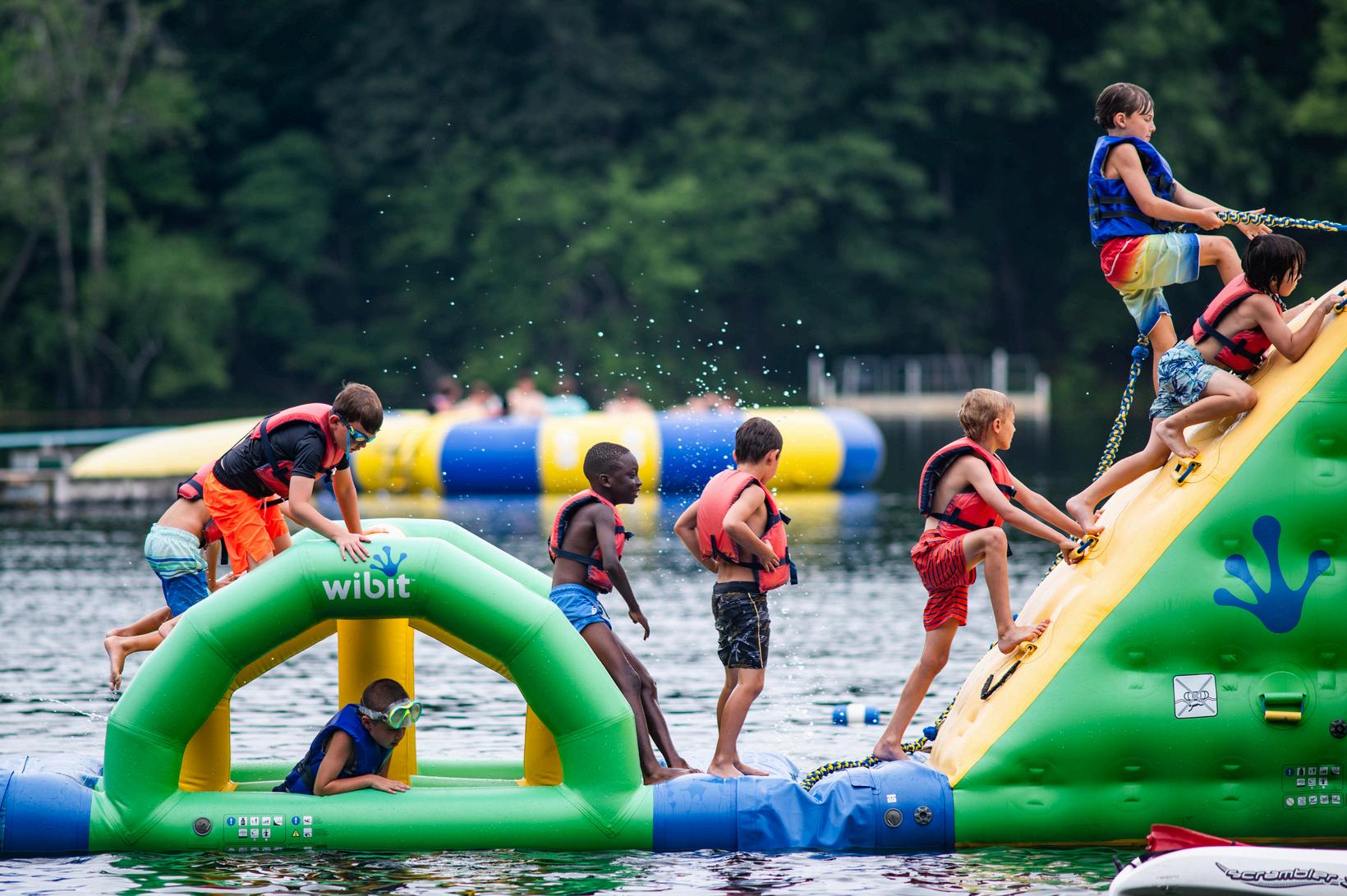2 waterfronts located on a 3/4-mile-long spring-fed lake The lake has inflatable trampoline, obstacle courses, slide, diving board, fishing docks, boats, and other water toys and activities.