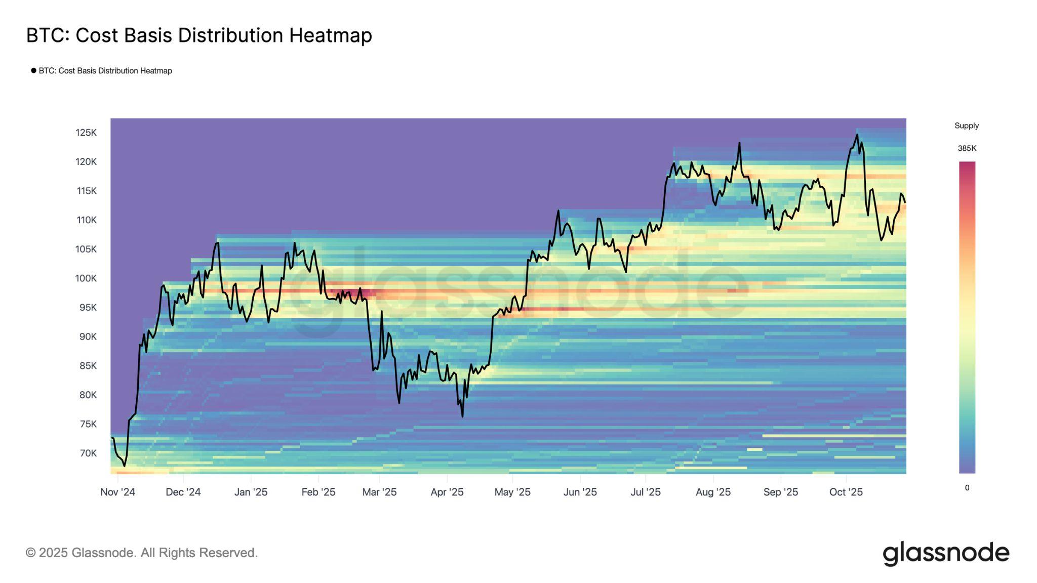 DatafromtheCostBasisDistributionHeatmap(seeFigure2above)showsthat the price twice rebounded from the midline near $116,000 before retracing towardrangelows.