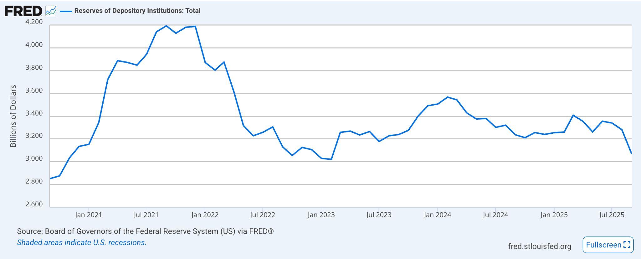 Under the new plan, the Fed will roll over all maturing Treasury securities beginning December 1st , keeping its bond holdings steady. Proceeds from maturing mortgage-backed securities MBS, which the Fed has struggled to unwind, will now be reinvested into Treasury bills. During the period of quantitative tightening, the Fed allowed roughly $60 billion in bonds to mature each month without reinvestment, shrinking reserves from around $4 trillion to $3 trillion See Figure 11 below). According to the Federal Reserveʼs Policy Normalizationframework,theTreasuryrunoffcaphadalreadybeenreducedto $5billionpermonthasofApril2025,whiletheMBScapremainedat$35billion. Now,underthenewplantakingeffectfromDecember1st,theFedwilleffectively halt the monthly balance-sheet decline. Removing these runoff caps could restore roughly $25 to $35 billion in monthly liquidity, easing the reserve depletionthathadbroughtbalancestonear$3trillion.