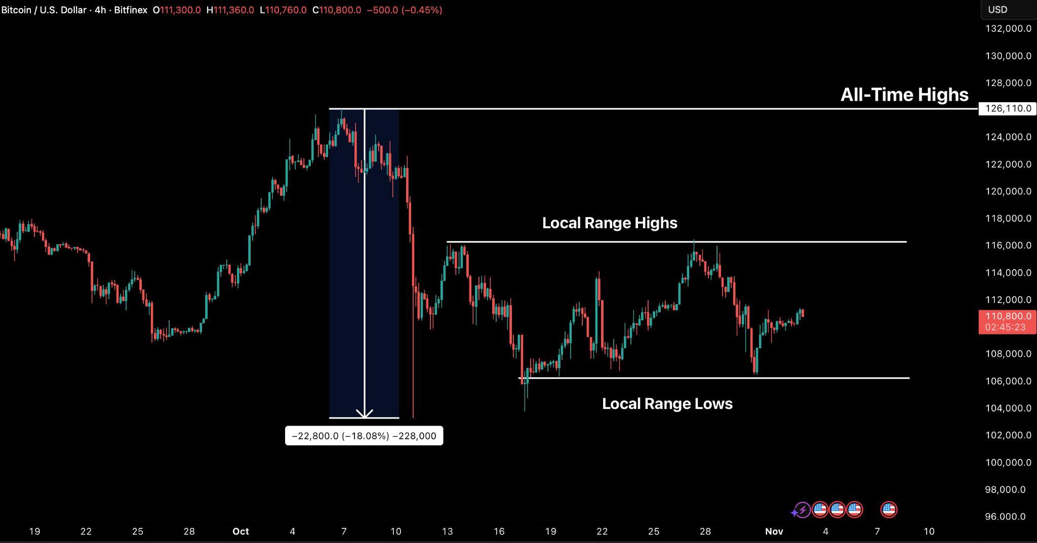 Over the past two weeks, Bitcoin has remained confined within a tight $106,000$116,000 range. Last week began with a relief rally peaking at $116,500 on Monday, 27 October, before the price retraced more than 8.9 percenttorevisitlocalrangelows.