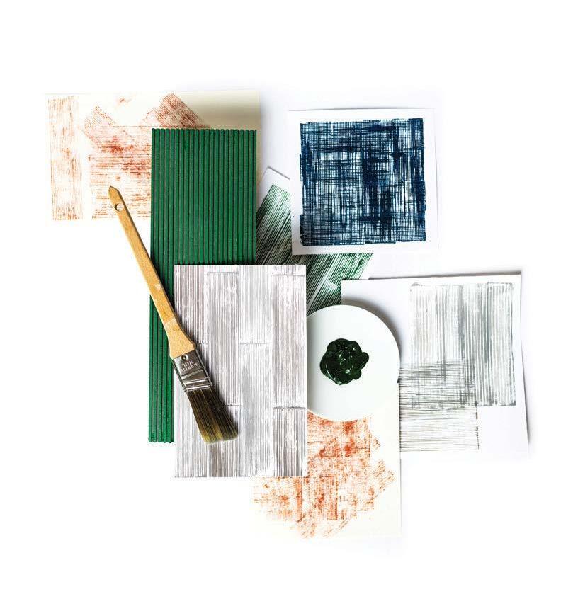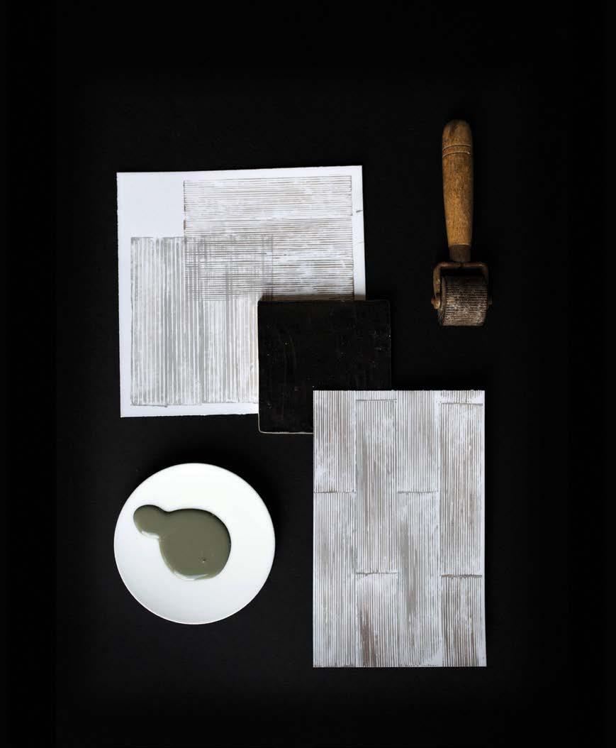 INSPIRED BY THE TECHNIQUE OF BLOCK PRINTING, OUR DESIGN PROCESS BEGAN WITH A SERIES OF HANDMADE PRINTS CREATED USING CARVED BLOCK STAMPS. WE EXPLORED DIFFERENT PATTERNING BY STACKING AND LAYERING THESE LINE MARKINGS TO CREATE TEXTURE AND SCALE.