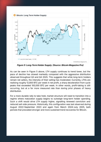 As can be seen in Figure 5 above, LTH supply continues to trend lower, but the pace of decline has slowed markedly compared with the aggressive distribution observedthroughoutQ3andQ42025.Thissuggeststhatwhilelong-termholders remainnetsellers,theintensityoftheirsellinghasmoderated.Currently,LTHsare realisingroughly12,800BTCperweekinnetprofit,asharpdecelerationfromcycle peaks that exceeded 100,000 BTC per week. In other words, profit-taking is still occurring, but at a far more measured rate than during prior phases of heavy distribution.