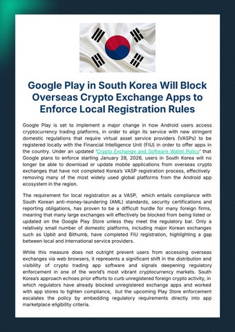 While this measure does not outright prevent users from accessing overseas exchangesviawebbrowsers,itrepresentsasignificantshiftinthedistributionand visibility of crypto trading app software and signals deepening regulatory enforcement in one of the worldʼs most vibrant cryptocurrency markets. South Koreaʼsapproachechoesprioreffortstocurbunregisteredforeigncryptoactivity,in which regulators have already blocked unregistered exchange apps and worked with app stores to tighten compliance, but the upcoming Play Store enforcement escalates the policy by embedding regulatory requirements directly into app marketplaceeligibilitycriteria.