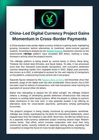 The projectʼs progress is being closely monitored by policymakers worldwide. mBridge was initially coordinated by the Bank for International Settlements, which steppedbackfromtheinitiativeinlate2024.Sincethen,theBIShasshiftedfocus to a separate multi-currency settlement project involving several major Western central banks. That effort, which includes cooperation with more than forty commercial banks, recently entered an expanded testing phase, signalling that competitiontoshapethefutureofcross-borderdigitalpaymentsisintensifying.