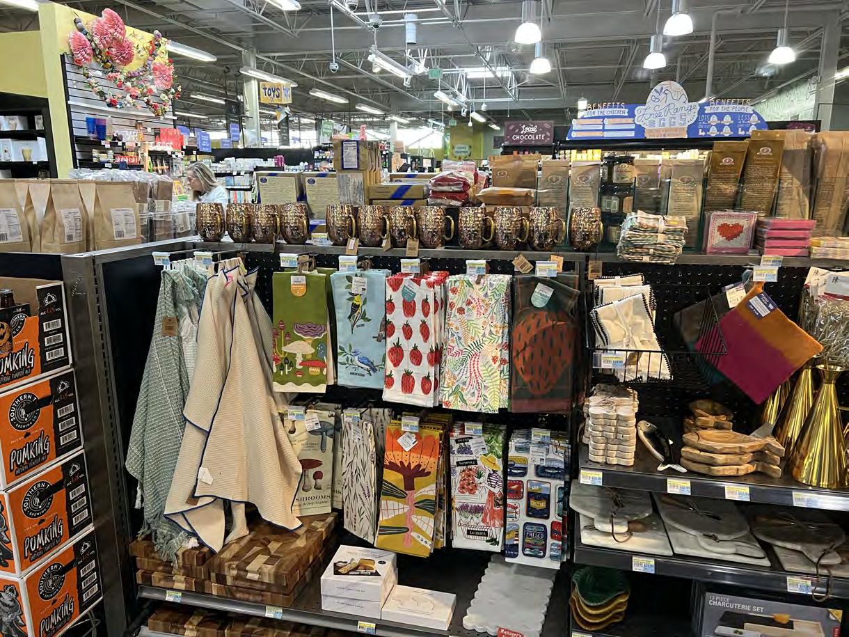 Always a great selection of potholders, measuring cups and spoons, aprons, tools and accessories, cutting boards, napkin rings, kitchen towels, cocktail supplies, and more located in 3 main areas: the end cap just past the tinned fish; the end cap between Wellness and the Frozen Foods; the end cap opposite at the end Frozen Foods; and the shelves between specialty foods and frozen fish.