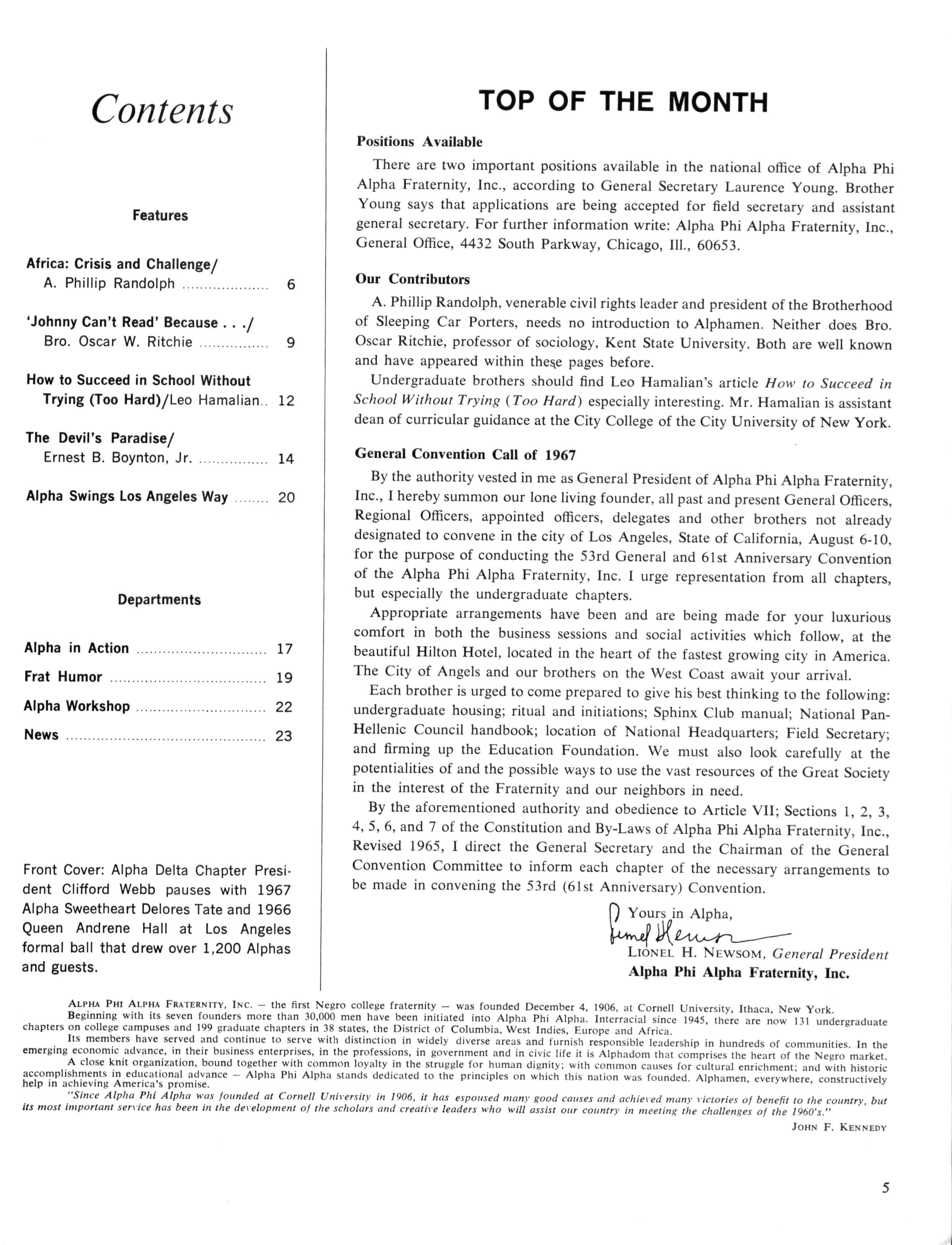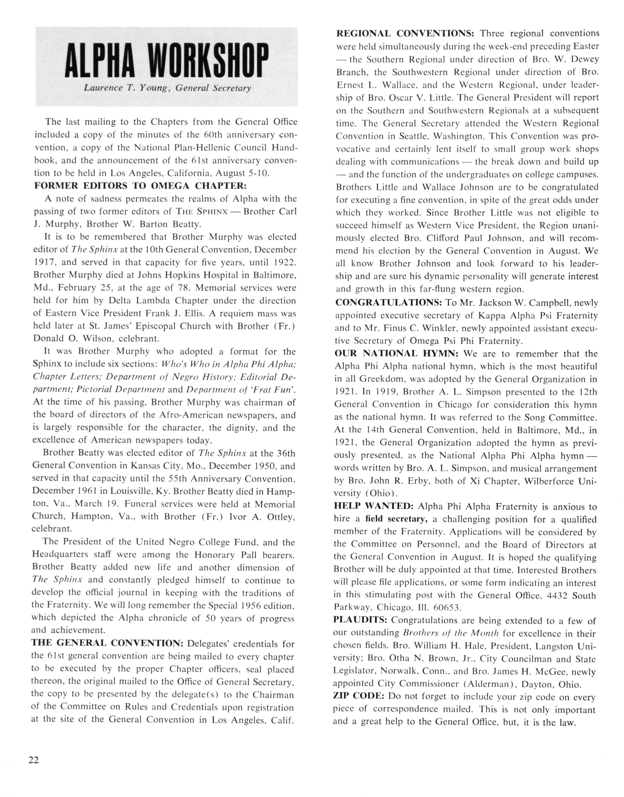 REGIONAL CONVENTIONS: Three regional conventions were held simultaneously during the week-end preceding Easter the Southern Regional under direction of Bro W Dewey Branch, the Southwestern Regional under direction of Bro Ernest L Wallace, and the Western Regional, under leadership of Bro Oscar V Little The General President will report on the Southern and Southwestern Rcgionals at a subsequent time The General Secretary attended the Western Regional Convention in Seattle, Washington This Convention was provocative and certainly lent itself to small group work shops dealing with communications — the break down and build up and the function of the undergraduates on college campuses. Brothers Little and Wallace Johnson are to be congratulated for executing a fine convention, in spite of the great odds under which they worked Since Brother Little was not eligible to succeed himself as Western Vice President, the Region unanimously elected Bro Clifford Paul Johnson, and will recommend his election by the General Convention in August We all know Brother Johnson and look forward to his leadership and are sure his dynamic personality will generate interest and growth in this far-flung western region