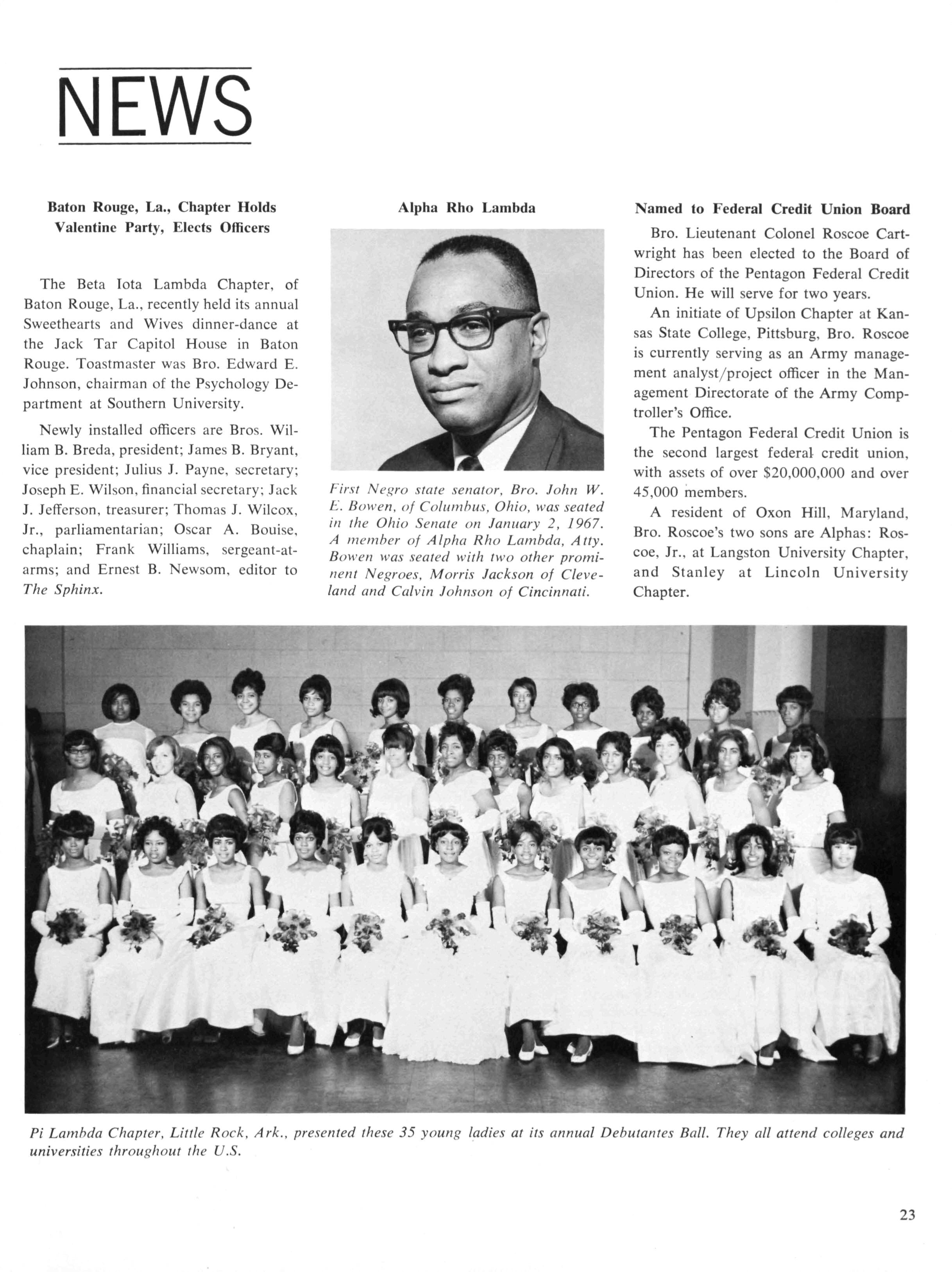 First Negro state senator, Bro. John W. E. Bowen, of Columbus, Ohio, was seated in the Ohio Senate on January 2, 1967. A member of Alpha Rho Lambda, Atty. Bowen was seated with two other prominent Negroes, Morris Jackson of Cleveland and Calvin Johnson of Cincinnati.