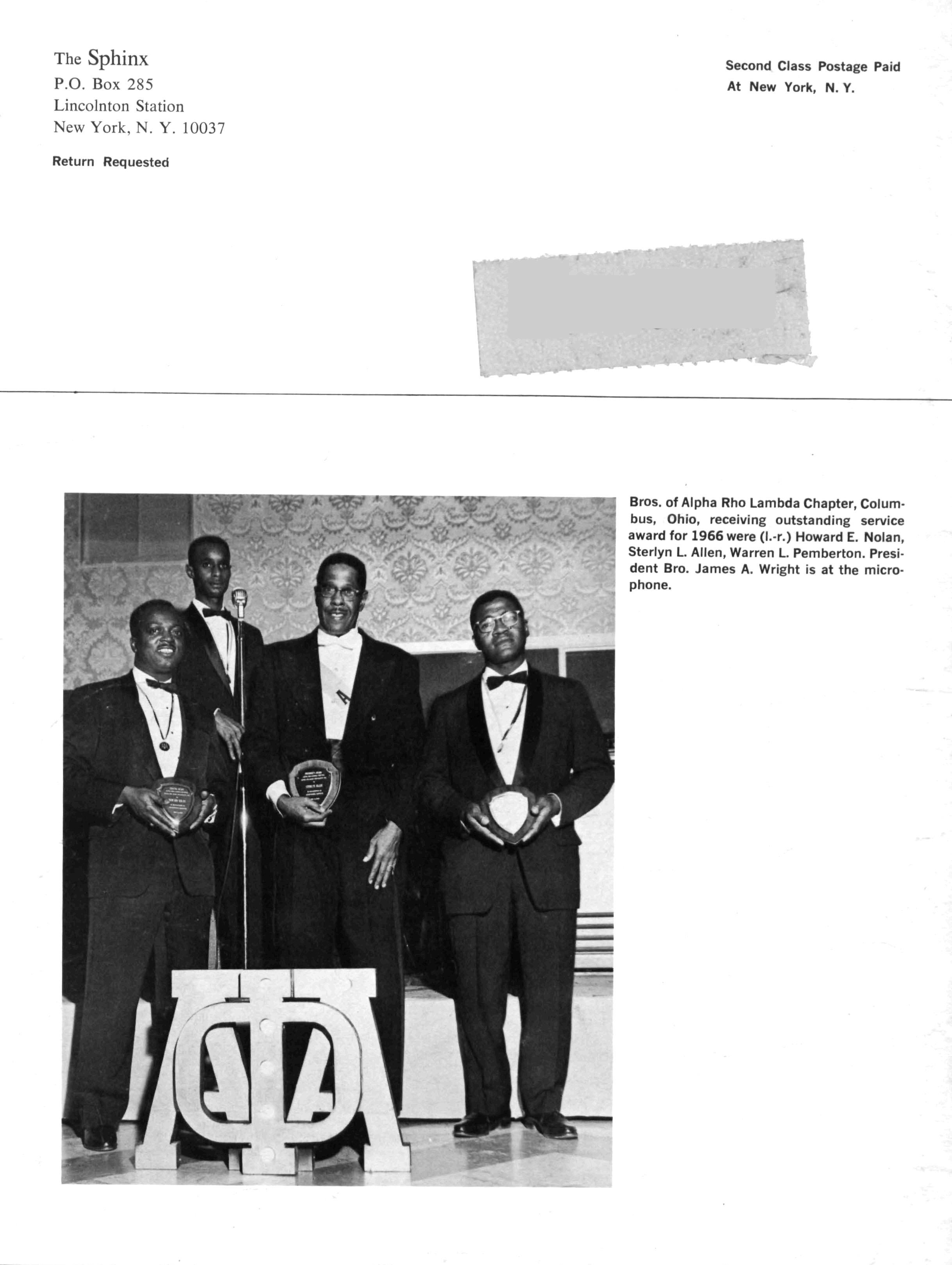 Bros, of Alpha Rho Lambda Chapter, Columbus, Ohio, receiving outstanding service award for 1966 were (l.-r.) Howard E. Nolan, Sterlyn L Allen, Warren L. Pemberton. President Bro. James A. Wright is at the micro-