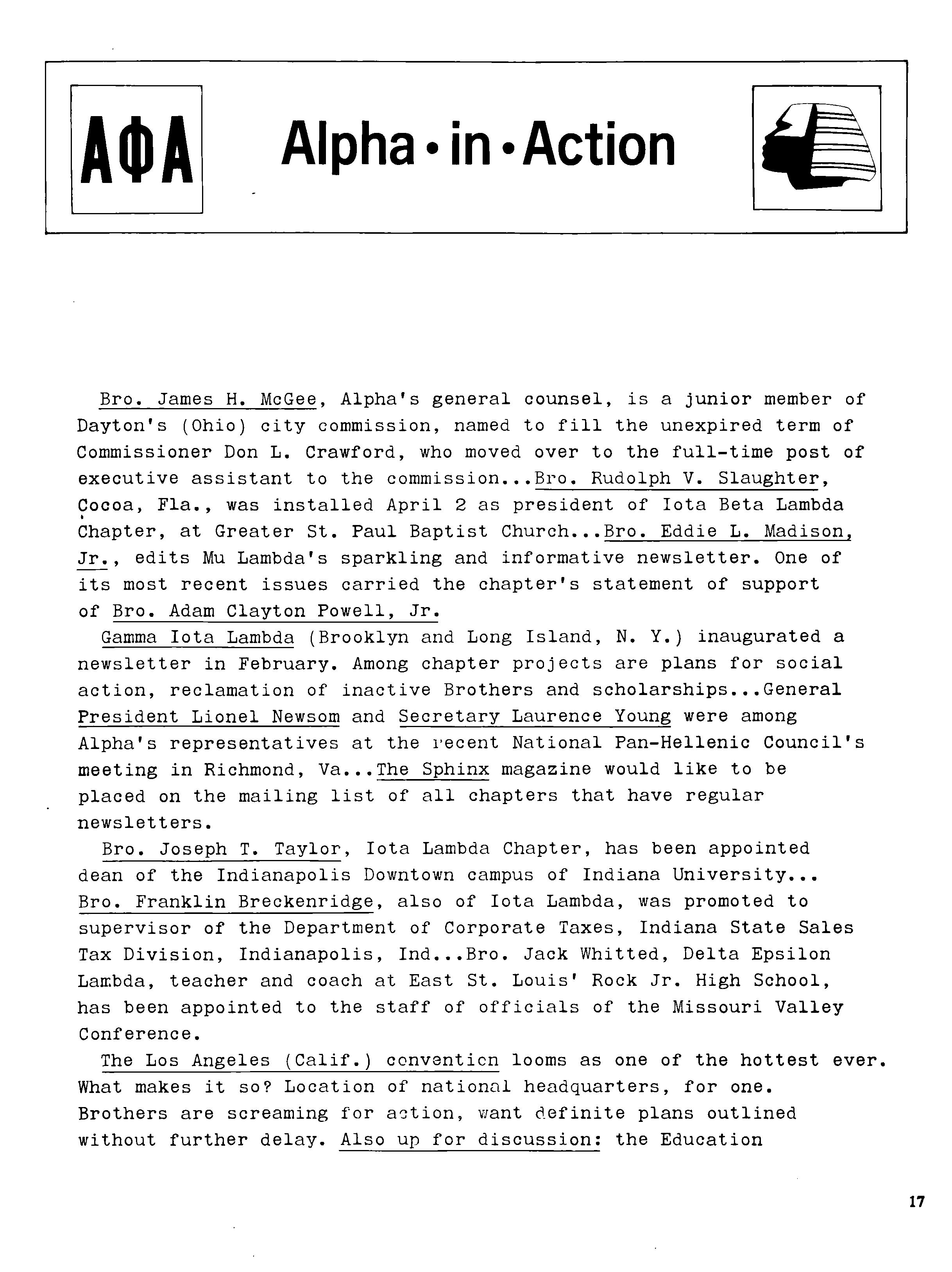 PLAUDITS: Congratulations are being extended to a few of our outstanding Brothers of the Month for excellence in their chosen fields. Bro. William H. Hale, President, Langston University; Bro Otha N Brown, Jr. City Councilman and State Legislator, Norwalk, Conn., and Bro James H McGee, newly appointed City Commissioner (Alderman), Dayton, Ohio
