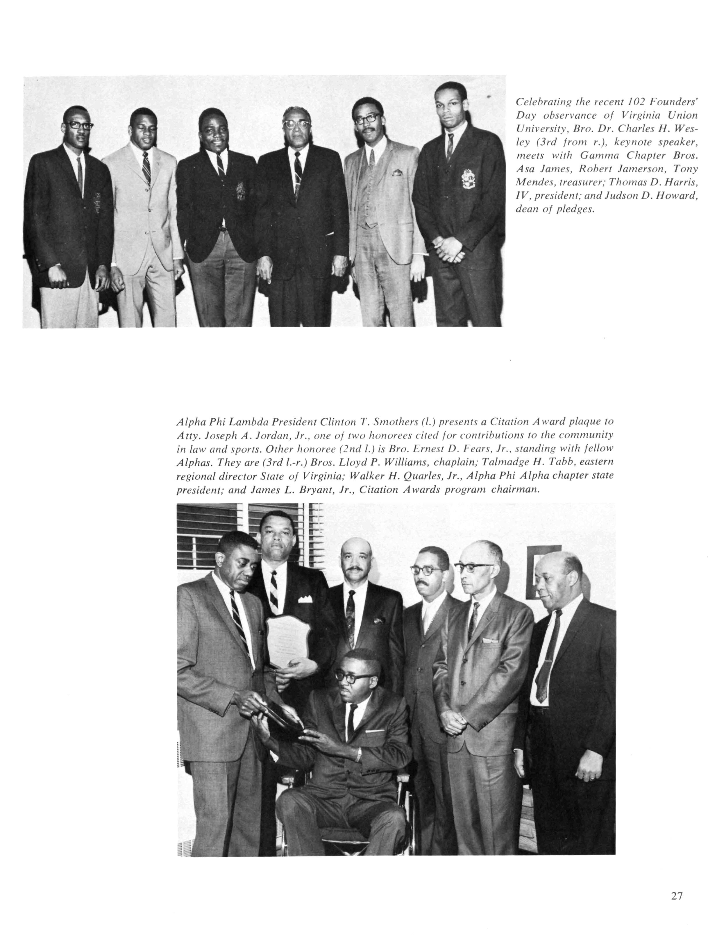 Alpha Phi Lambda President Clinton T. Smothers (I.)presents aCitation Award plaque to Atty. Joseph A. Jordan, Jr., one of two Iwnorees cited for contributions to the community in law and sports. Other honoree (2nd I.)isBro. Ernest D. Fears, Jr., standing with fellow Alphas. They are(3rd l.-r.)Bros. Lloyd P. Williams, chaplain; Talmadge H. Tabb, eastern regional director State of Virginia; Walker H. Quarles, Jr., Alpha Phi Alpha chapter state president; and James L. Bryant, Jr., Citation Awards program chairman.