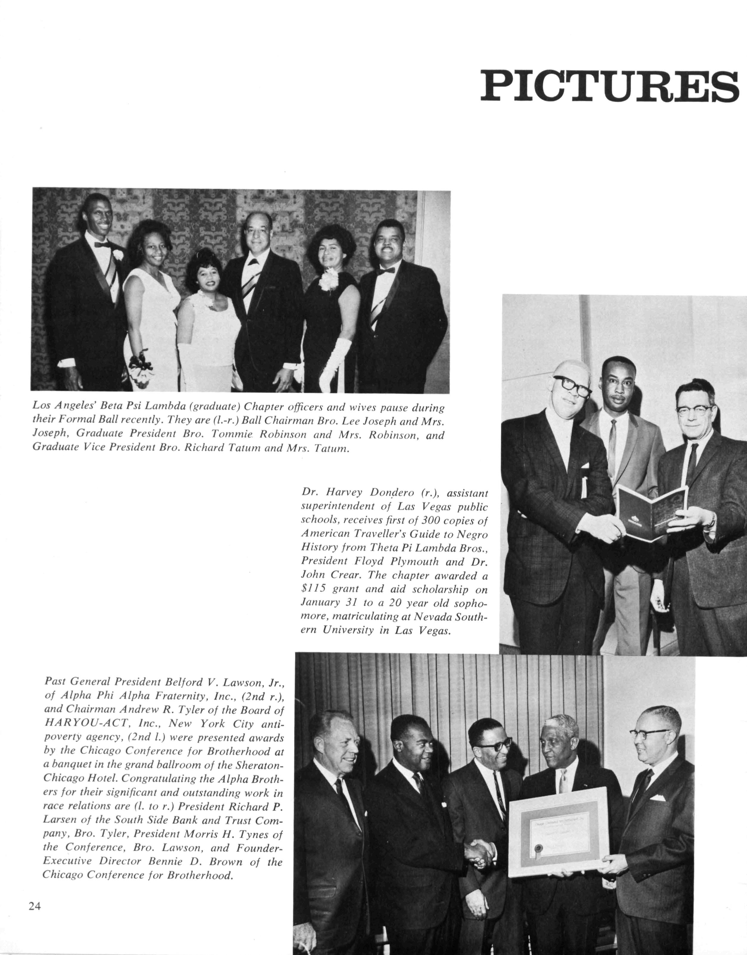 Past General President Belford V. Lawson, Jr., of Alpha Phi Alpha Fraternity, Inc., (2nd r.), and Chairman Andrew R. Tyler of the Board of HARYOU-ACT, Inc., New York City antipoverty agency, (2nd I.) were presented awards by the Chicago Conference for Brotherhood at abanquet in thegrand ballroom of the SheratonChicago Hotel. Congratulating the Alpha Brothersfor their significant and outstanding work in race relations are (I. to r.) President Richard P. Larsen of the South Side Bank and Trust Company, Bro. Tyler, President Morris H. Tynes of the Conference, Bro. Lawson, and FounderExecutive Director Bennie D. Brown of the Chicago Conference for Brotherhood.