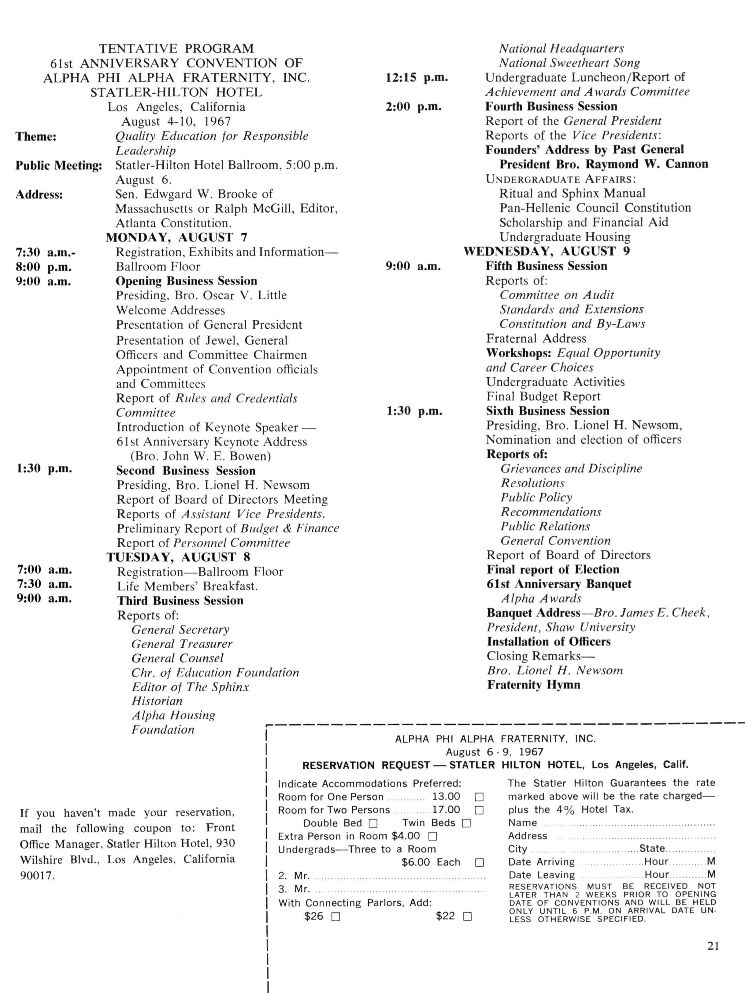 The last mailing to the Chapters from the General Office included a copy of the minutes of the 60th anniversary convention, a copy of the National Plan-Hellenic Council Handbook, and the announcement of the 61st anniversary convention to be held in Los Angeles, California, August 5-10.