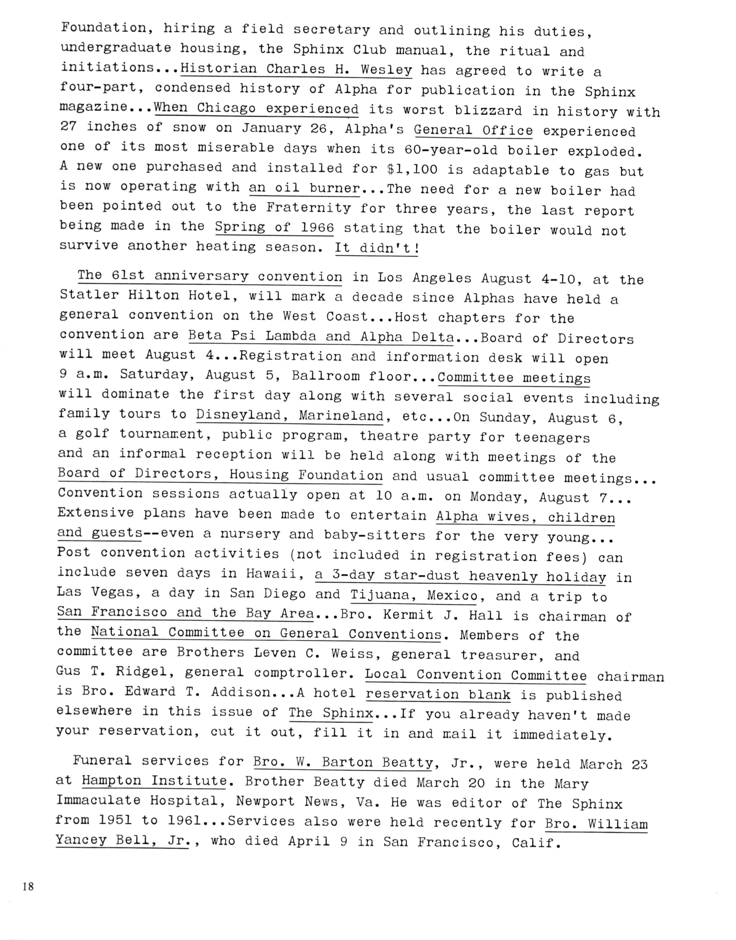 Brother Beatty was elected editor of The Sphinx at the 36th General Convention in Kansas City, Mo., December 1950, and served in that capacity until the 55th Anniversary Convention, December 1961 in Louisville, Ky Brother Beatty died in Hampton, Va., March 19 Funeral services were held at Memorial Church, Hampton, Va., with Brother (Fr.) Ivor A Ottley, celebrant.