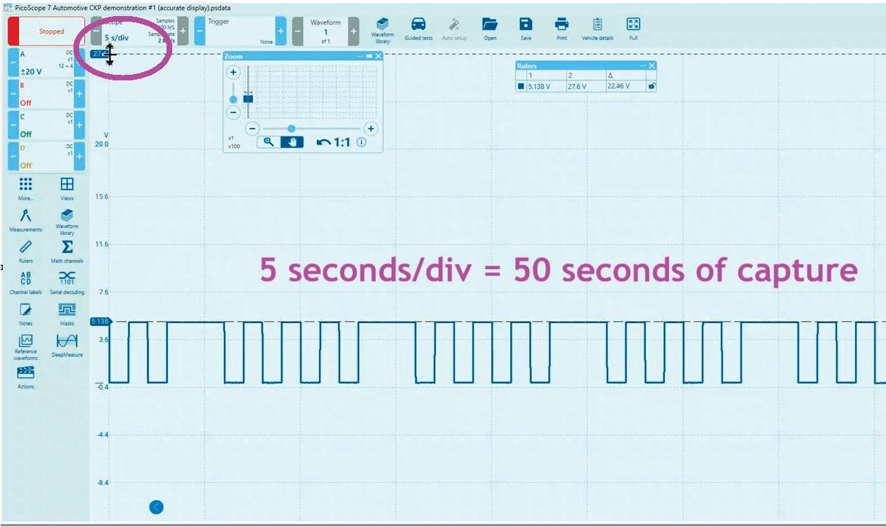  Figure 5 — A crankshaft position sensor (CKP) signal is being captured from an idling engine. With 50 seconds of capture time, there is more than sufficient sample rate to accurately display the sensor’s output. Photo courtesy of Brandon Steckler