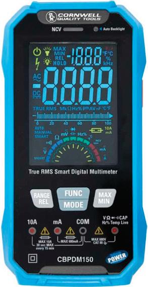 The Cornwell Quality Tools CBPDM150 True RMS Smart Digital Multimeter with Color LCD offers smart meter capability, allowing it to automatically detect if the user is measuring voltage (AC/DC), resistance, or continuity. It features an ultra-fast screen refresh rate, an auto-brightening screen, and dual display. The CBPDM150’s test functions include volts, ohms, continuity, amps, capacitance, diodes, frequency, and temperature. It indicates a blown fuse with an on-screen message, eliminating the guesswork with a 0 amp reading. It measures up to 600V AC/DC, 10A, and 600mA, and the unit comes with 40” test leads, a temperature probe, batteries, and an instruction manual.