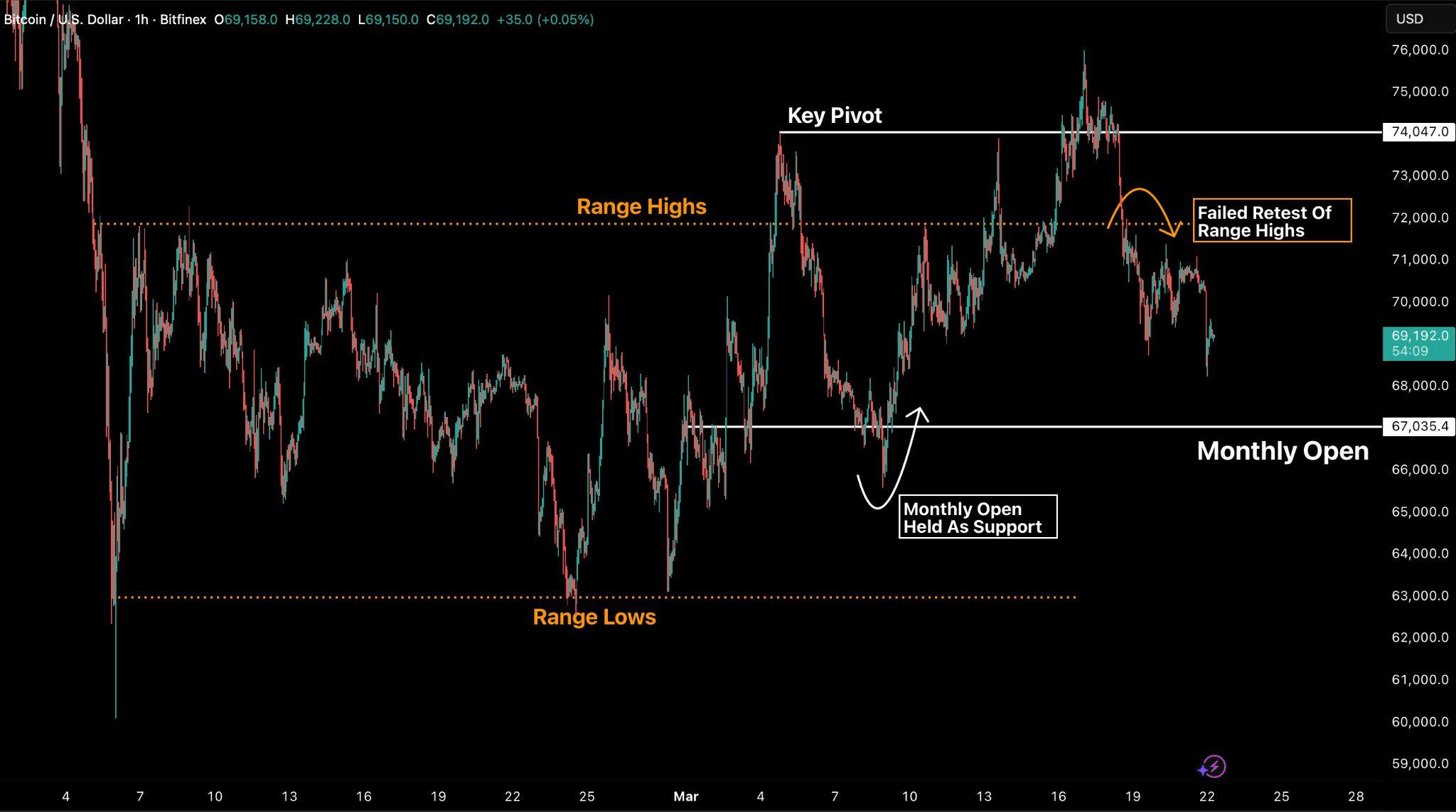 Cácyếutốvĩmôtuầntrướcđãkíchhoạtnhịpgiảmtừđỉnhxuốngđáy10,2%, kéogiátừ$76.000vềmứcthấpnhấttuầnlà$67.363vàochủnhậtngày22/3, nhưngvẫntrênvùngquantrọng$67.035mởcửatháng3.Mốccấutrúcnày chothấyđộbềnđángkểkhiliêntụcđóngvaitròlàvùngđỡtrongsuốtdiễn biếntháng.Sangthứhai23/3,BTCbậttăngmạnhsaukhiTổngthốngTrump thôngbáohoãncáccuộctấncôngvàonhàmáyđiệnIran.