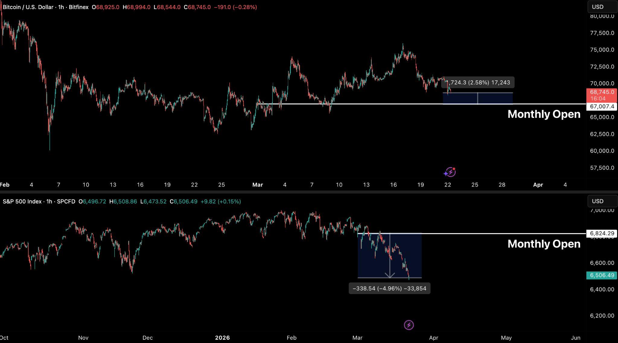 GócnhìnrõhơnvềbiếnđộnggiáBTCxuấthiệnkhiđặttrongtươngquanvớithị trườngcổphiếu.TrongkhiS&P500giảmxuốngmứcthấp6.564điểm,giaodịch dướivùngmởcửatháng3vàquaylạiđáytháng11/2025,BTCvẫnbảovệthành côngvùngmởcửathángcủamình.