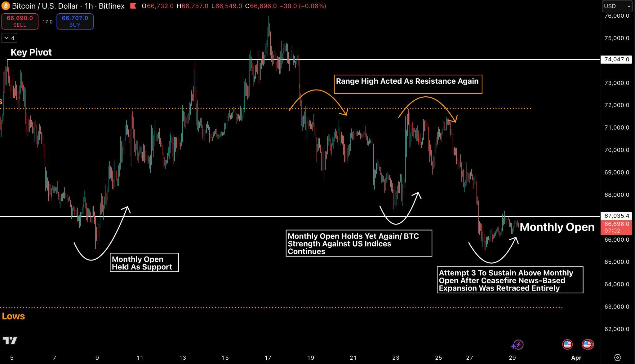 Diễn biến giá Bitcoin gần đây, dù vẫn đang đi ngang và nỗ lực tìm kiếm một sự thay đổi về hướng đi, đã cho thấy một cấu trúc quan trọng tiềm ẩn. Sau khi mở cửatuầnởmức$67.870,chạmđỉnh$71.843trướckhigiảmmạnh8,8%xuốngcòn