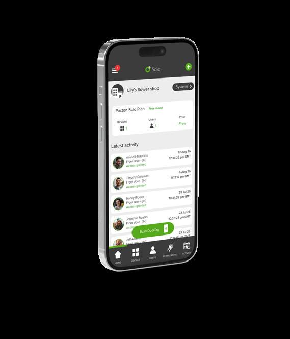 To gain access through a Solo controlled door, the Paxton Solo app makes the access decision and then communicates this to the cloud via secure Bluetooth® communication, with end-toend encryption, providing the most cyber secure system from Paxton to date.