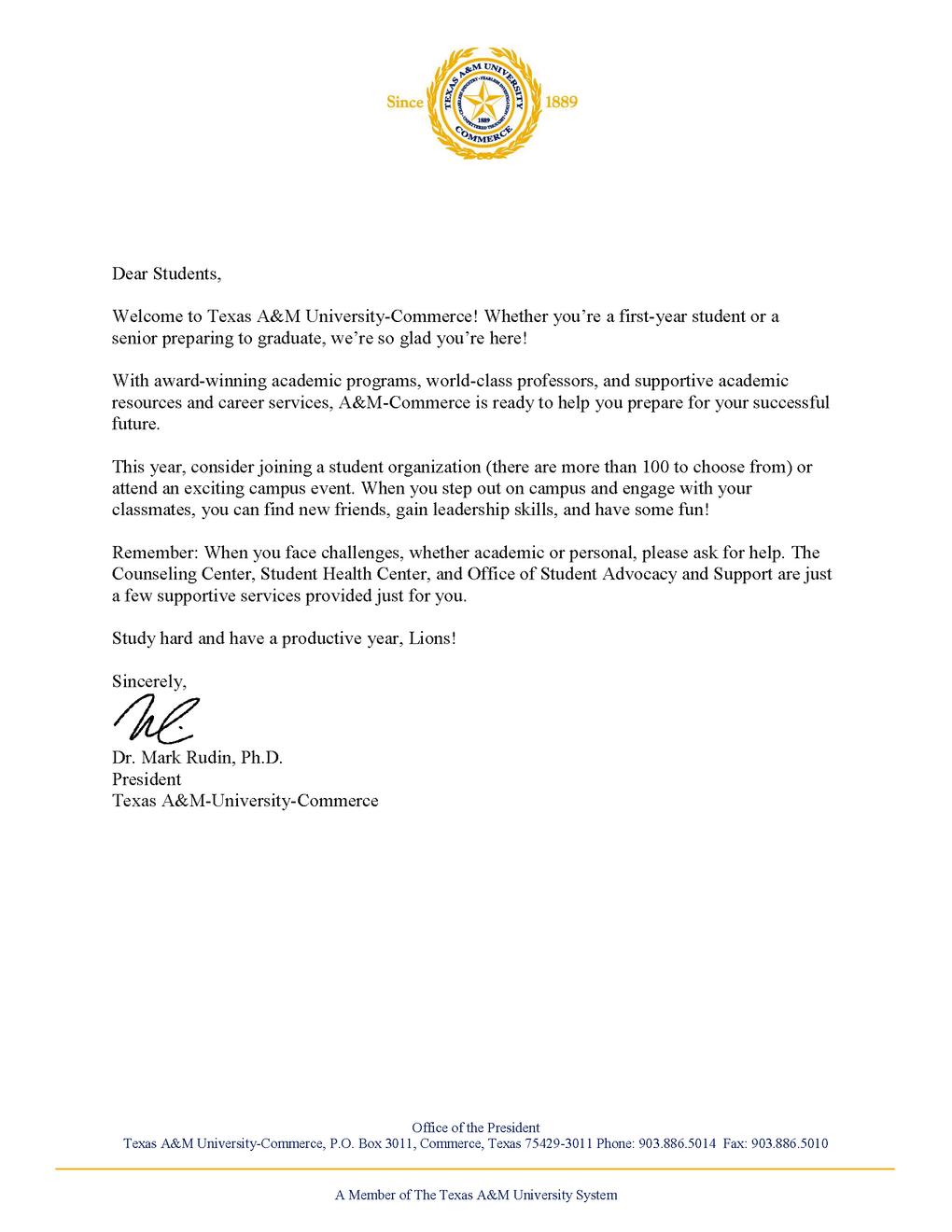 WELCOME TO TEXAS A&M e are so excited to have you here as the newest addition to our Lion Pride! Your journey at A&MCommerce is about to begin, and we want to make sure it is an unforgettable experience As you step onto our beautiful campus, you will quickly discover that A&M-Commerce is more than just a university; this is a place where dreams are nurtured, talents are honed, and lifelong friendships are forged Whether you are starting your academic career as a freshman, transferring from another institution, or pursuing other endeavors, you’ve joined a university that values your individuality and your aspirations for your future