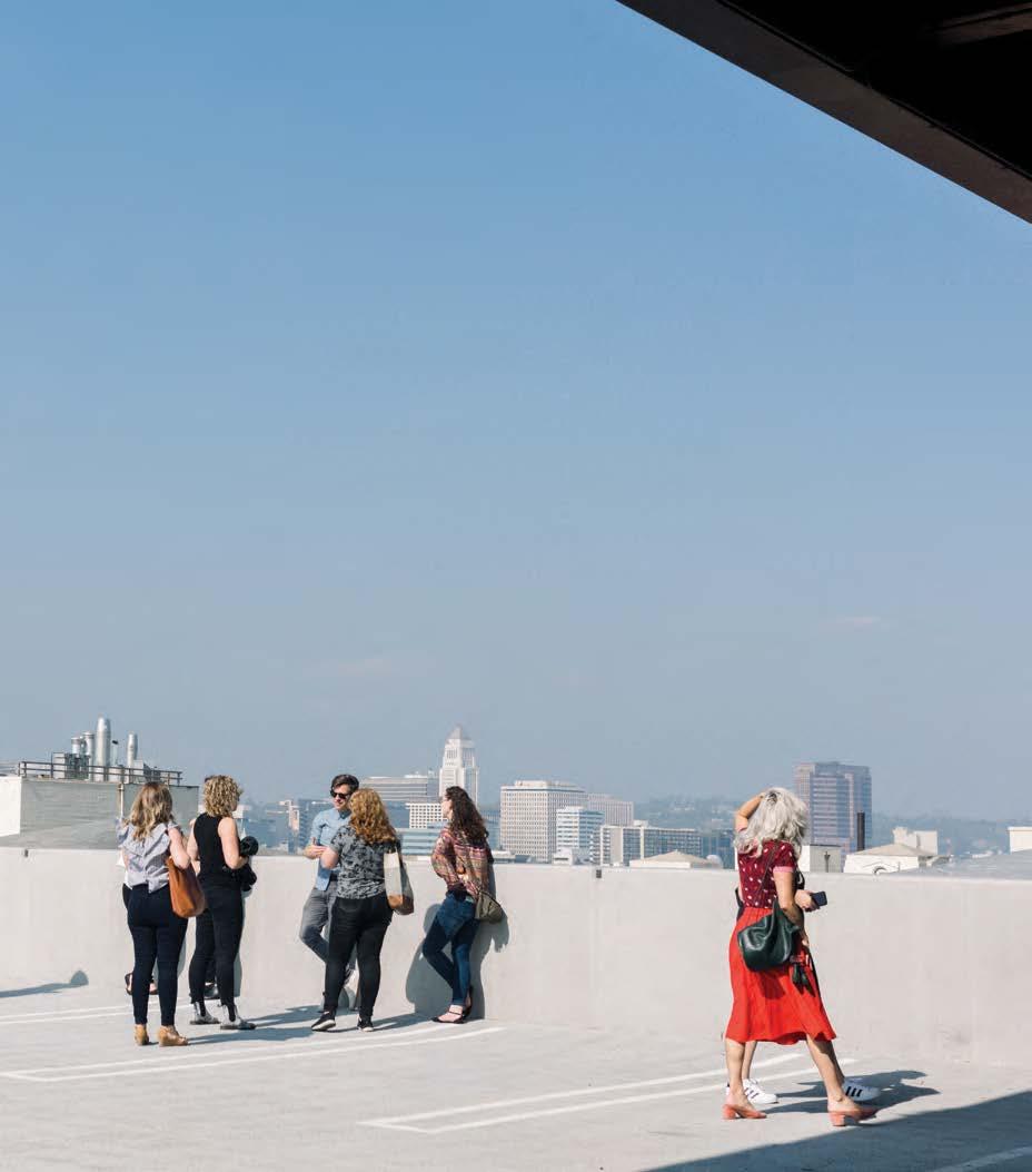 pictured clockwise: 1. ) Mariana Orkenyi, meditation and mindfulness teacher, Jaime Derringer, Design Milk Founder + Chief Creative Officer and Shannon Cochran, VP of Creative + Design for Patcraft discuss the practice of mindfulness in the creative process at the 2018 workshop. 2.) Design and architecture tour of The Row, led by Rios Clementi Hale during the workshop in Los Angeles, 2018. 3. ) The group explores the multi-sensory excersize of flower crushing at Atlanta Botanical Garden in 2019. 4. ) Shannon and Jaime host panelists Nujhat Jahid-Alam, Senior Occupancy Planner, CBRE Global Workplace (Coca-Cola) and Jennifer Edwards, WGSN Consultant Director to discuss consumer drivers and the importance of connectivity during the 2020 workshop.