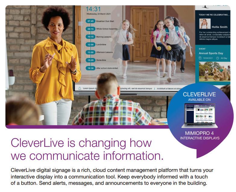 CleverLive digital signage is a cloud content management platform that turns an interactive display into a communication tool, providing alerts, messages, and announcements. Tech & Learning judges called it “a very good solution.”
