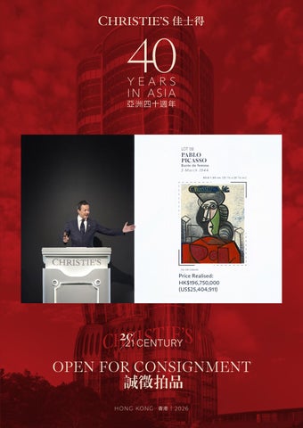 This year marks Christie’s 40th anniversary in Asia – a milestone that reflects the increasingly sophisticated collecting culture in the region, and the emergence of a dynamic new generation of collectors. As we prepare for the commemorative 40th anniversary sales, we are now inviting consignments and look forward to collaborating with collectors and art lovers to shape an inspiring new chapter together.