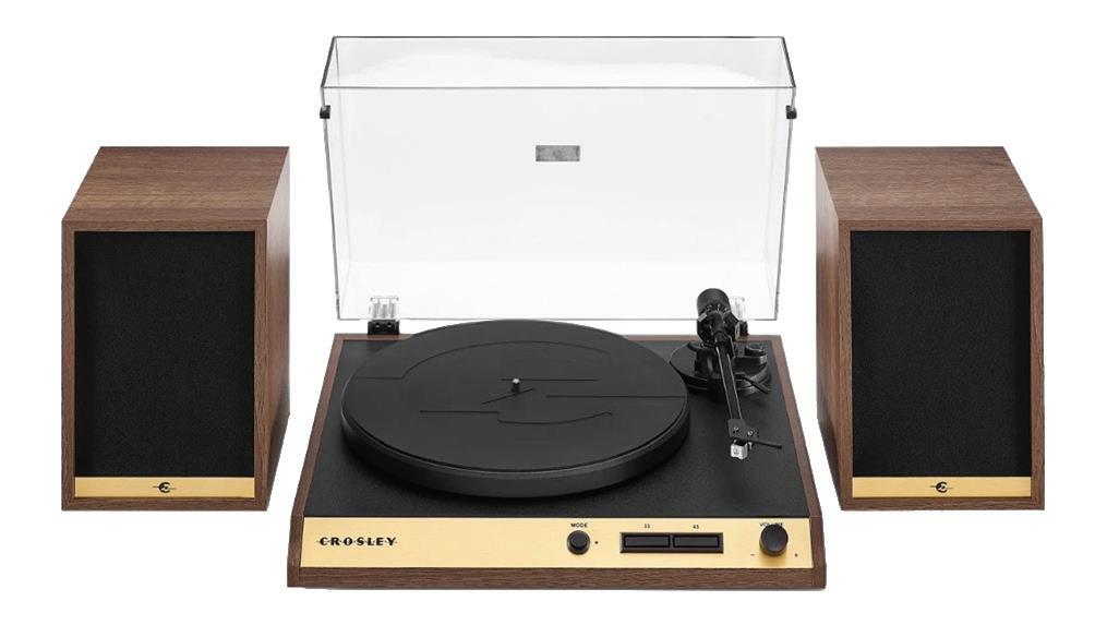 speaker cabinets and turntable plinth made of 70's inspired classic wood grain with gold accents