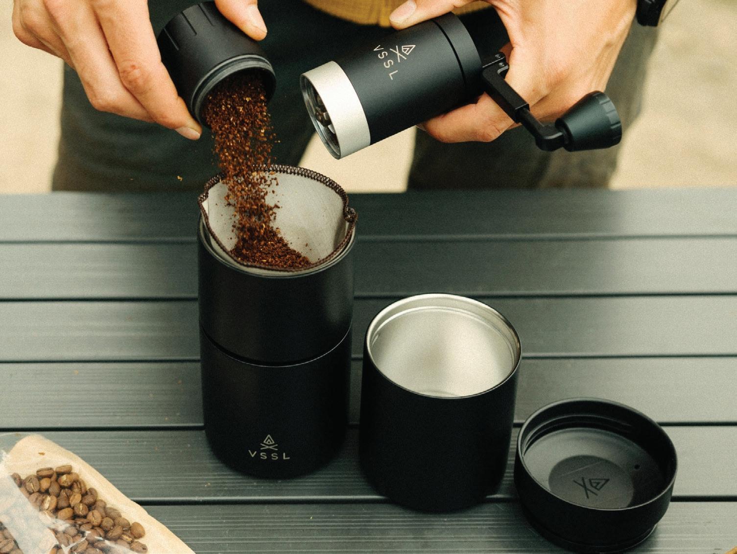 6-piece kit assembles into one compact unit, ideal for making and drinking coffee outside