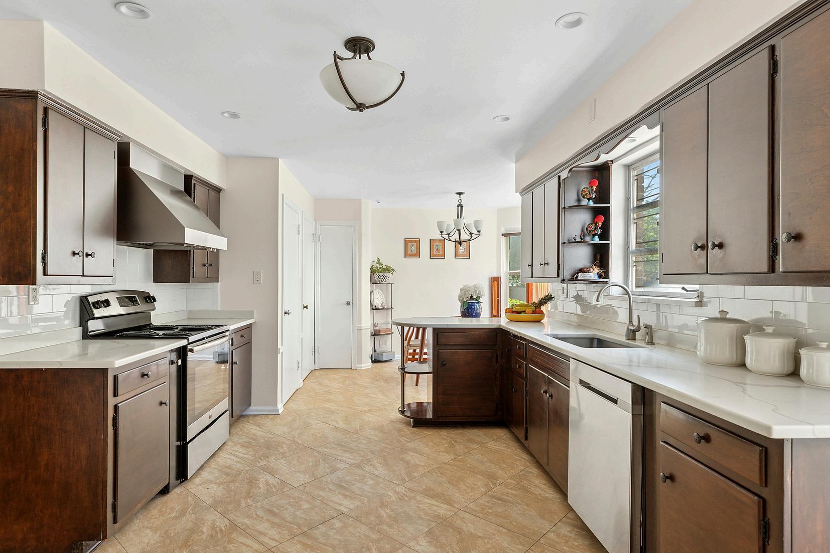 This expansive eat-in kitchen is made for creating culinary delights, complete with quartz countertops, a farm sink, stainless-steel appliances, and a breakfast nook for casual dining. Spacious Eat-in-Kitchen