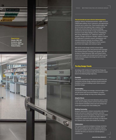 Building Community: Research talent prefers vibrant communities with diverse people and areas of expertise, amenities, and other scientists from various disciplines. The idea is that worldchanging discoveries are made when ideas collide in unexpected, unplanned ways and design can help foster the collisions that create these intellectual overlaps. Collaboration: This trend is inspired by workplace strategy and driven by stiff competition for top talent, employee wellness, and speed to market concerns. Crucial for the future of scientific discovery are venues for interdisciplinary collaboration. ARCHITECTURAL PRODUCTS