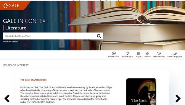 Gale In Context: Literature organizes highquality literary resources into one searchable platform, complete with accessibility and navigation tools. Educators easily connect students to standards-based resources that provide the literary context necessary to ensure student understanding of the texts they’re reading in ELA lessons.