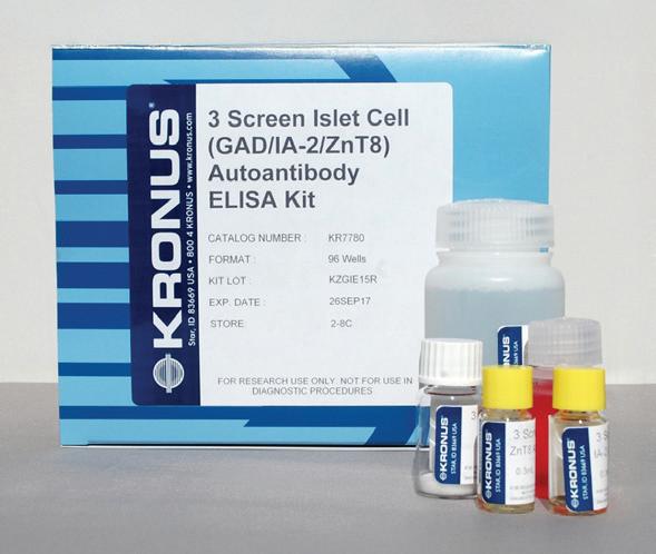 t he K ronus 3- screen Islet c ell a utoantibody el Isa a ssay Kit is for the simultaneous detection of autoantibodies to gad and/or I a -2 and/or Znt 8 in human serum. a bsorbance is measured and is proportional to the total amount of autoantibodies present. For research use only. not For use in diagnostic Procedures.