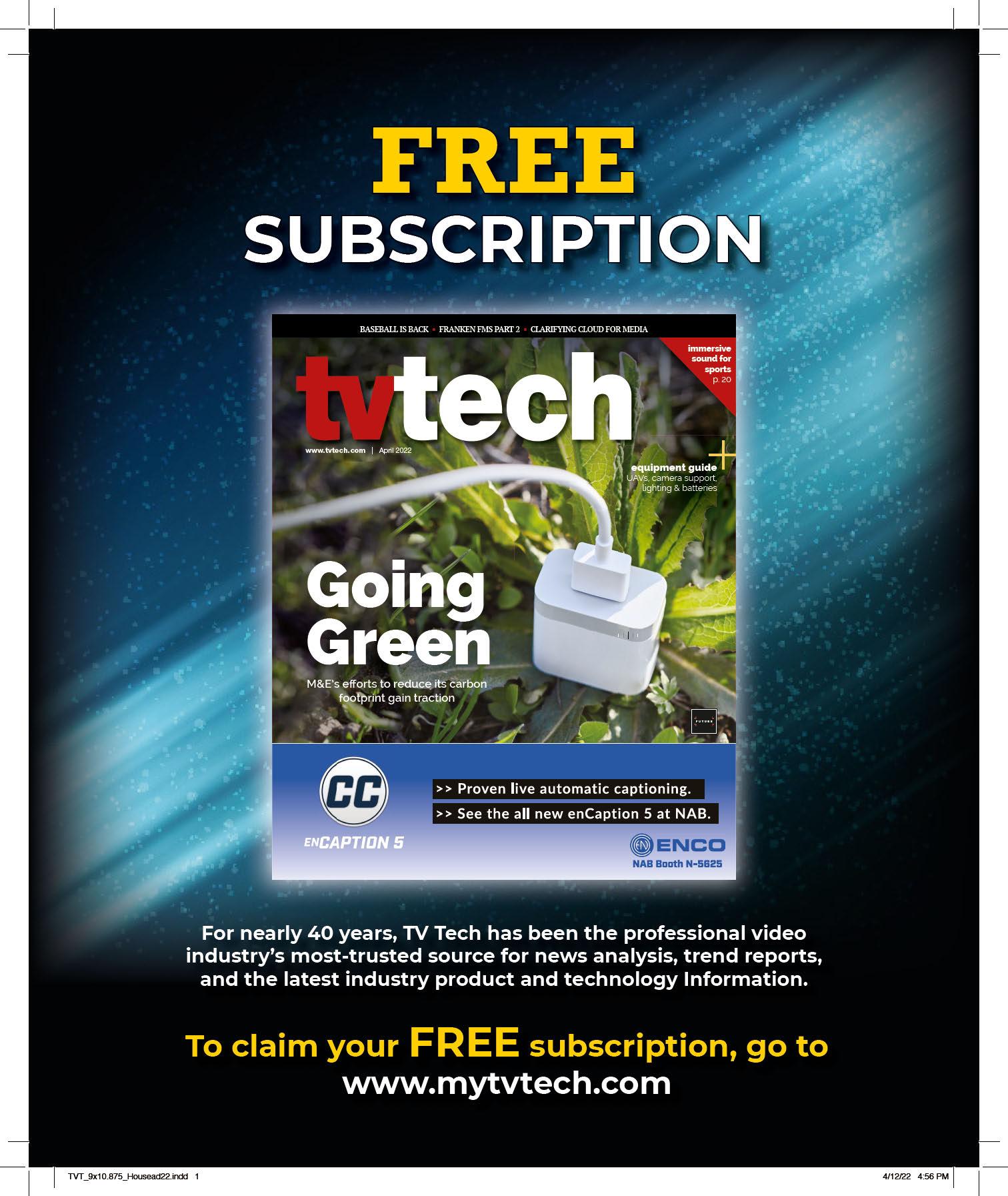 For nearly 40 years, TV Tech has been the professional video industry’s most-trusted source for news analysis, trend reports, and the latest on industry technology and product innovations. You don't want to miss the next issue. Subscribe today!equipment guide audio www.tvtech.com September 2022 THE BASICS OF RF LIVE PRODUCTION OVER IP METAVERSE OR METAMUCIL? NFL Preview p. 16 CAMPAIGN 2022 How broadcasters are using new tools to keep voters informed To claim your FREE subscription, go to www.mytvtech.com