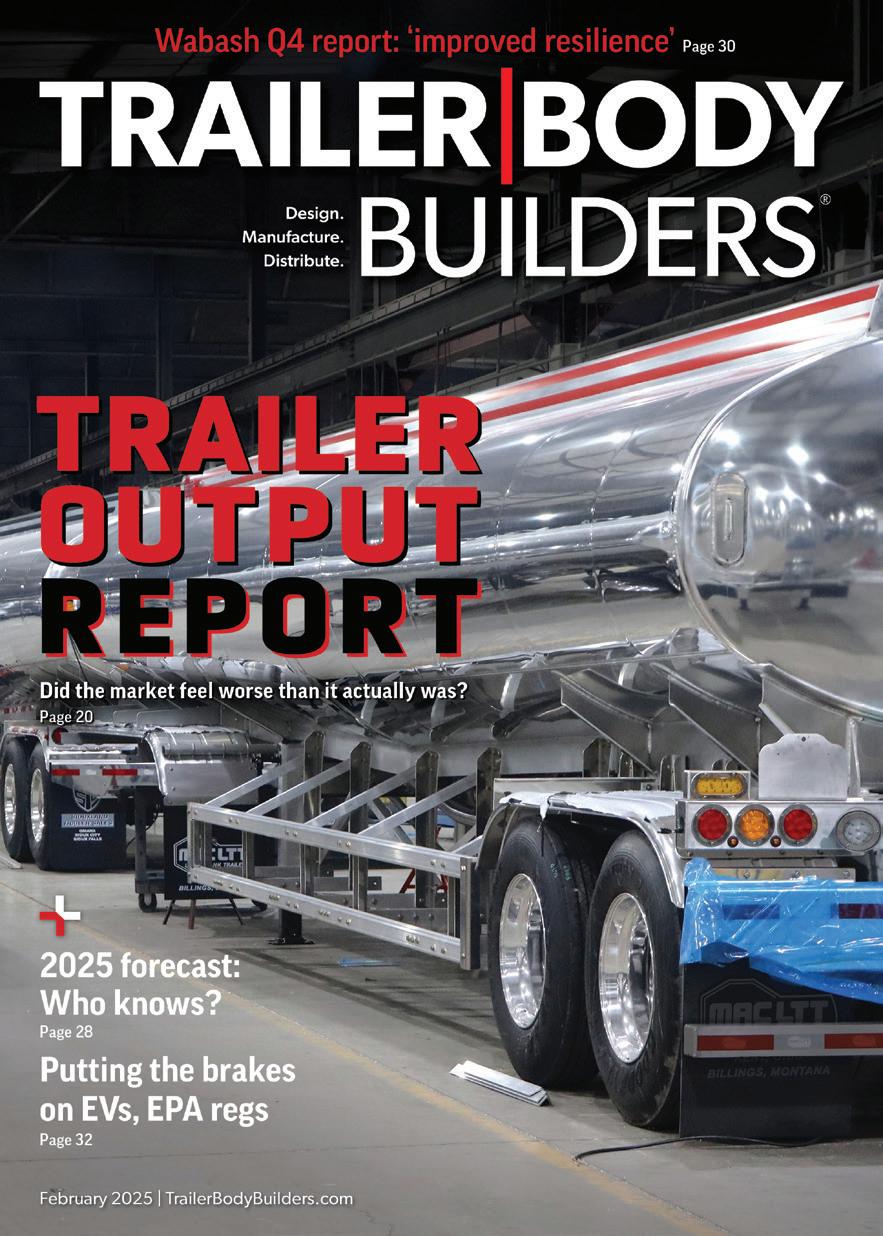 TRAILER|BODY BUILDERS (USPS Permit 636660, ISSN 0041-0772 print, ISSN 2771-7542 online) Volume 67 Issue 4, is published monthly by Endeavor Business Media, LLC. 201 N Main St, 5th Floor, Fort Atkinson, WI 53538. Periodicals postage paid at Fort Atkinson, WI, and additional mailing offices. POSTMASTER: Send address changes to Trailer/Body Builders, PO Box 3257, Northbrook, IL 60065-3257. SUBSCRIPTIONS: Publisher reserves the right to reject non-qualified subscriptions. Subscription prices: U.S. ($81.37 per year); Canada/Mexico ($81.37 per year); All other countries ($161.71 per year). All subscriptions are payable in U.S. funds. Send subscription inquiries to Trailer/Body Builders, PO Box 3257, Northbrook, IL 60065-3257. Customer service can be reached toll-free at 877-382-9187 or at trailerbodybuilders@omeda.com for magazine subscription assistance or questions.