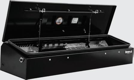 Offset design allows the lid to open a full 90° when placed against the truck cab. Push-button locks on either side of the box. Four unique tool holder trays included for added organization. Heavy-duty 12-ga carbon steel construction.