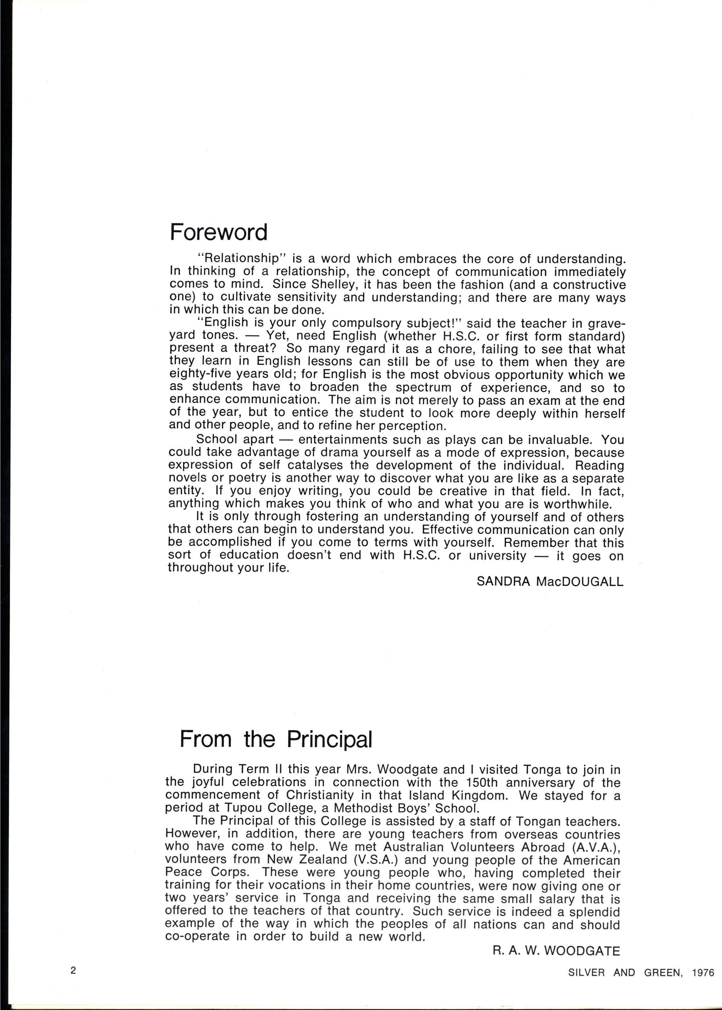Durin g Ter m II thi s yea r Mrs . Woodgat e and I visite d Tong a t o joi n in th e joyfu l celebration s in connectio n wit h th e 150t h anniversar y of th e commencemen t of Christianit y in tha t Islan d Kingdom W e staye d fo r a perio d at Tupo u College , a Methodis t Boys ' School Th e Principa l of thi s Colleg e is assiste d by a staf f of Tonga n teachers However , in addition , ther e are youn g teacher s fro m oversea s countrie s wh o have com e t o help W e me t Australia n Volunteer s Abroa d (A.V.A.), volunteer s fro m Ne w Zealan d (V.S.A. ) and youn g peopl e of th e America n Peac e Corps . Thes e wer e youn g peopl e who , havin g complete d thei r trainin g fo r thei r vocation s in thei r hom e countries , wer e no w givin g on e o r tw o years ' servic e in Tong a and receivin g th e sam e smal l salar y tha t is offere d t o th e teacher s of tha t country . Suc h servic e i s indee d a splendi d exampl e of th e wa y in whic h th e people s of all nation s ca n and shoul d co-operat e in orde r t o buil d a ne w world