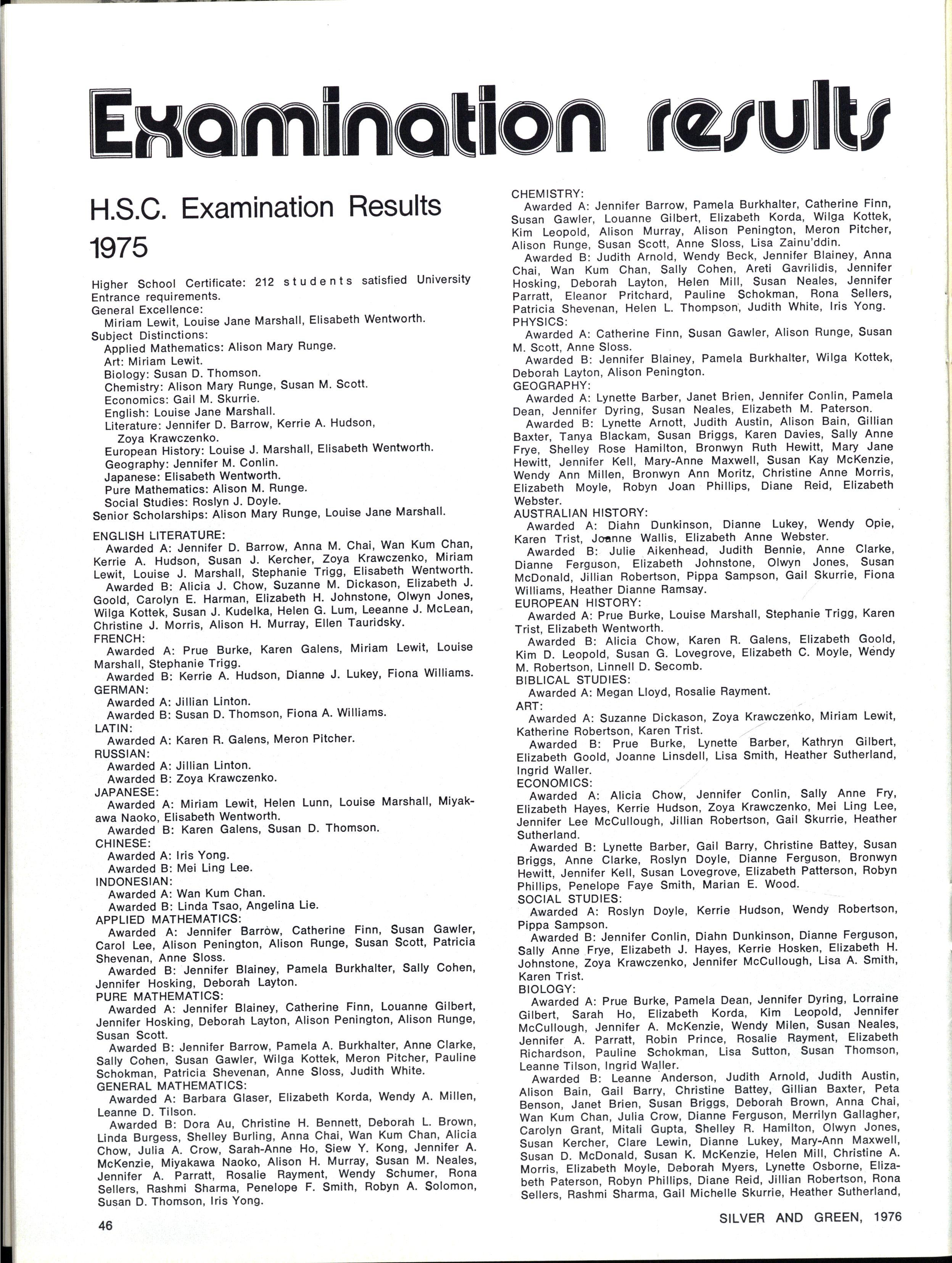 Honours: Lea Care, Veda Chang, Robyn Clarke, Katherine Clarke, Lanna Dawkins, Julia Douglas, Judith Drew, Merrilyn Frank, Debra Hartley, Barbara Heath, Jennifer Miller, Anne Miles, Kay Newman, Janet Phillips, Bronwen Pye, Robyn Sutcliffe, Fiona Trigg, Angela Weir, Margaret Welsford