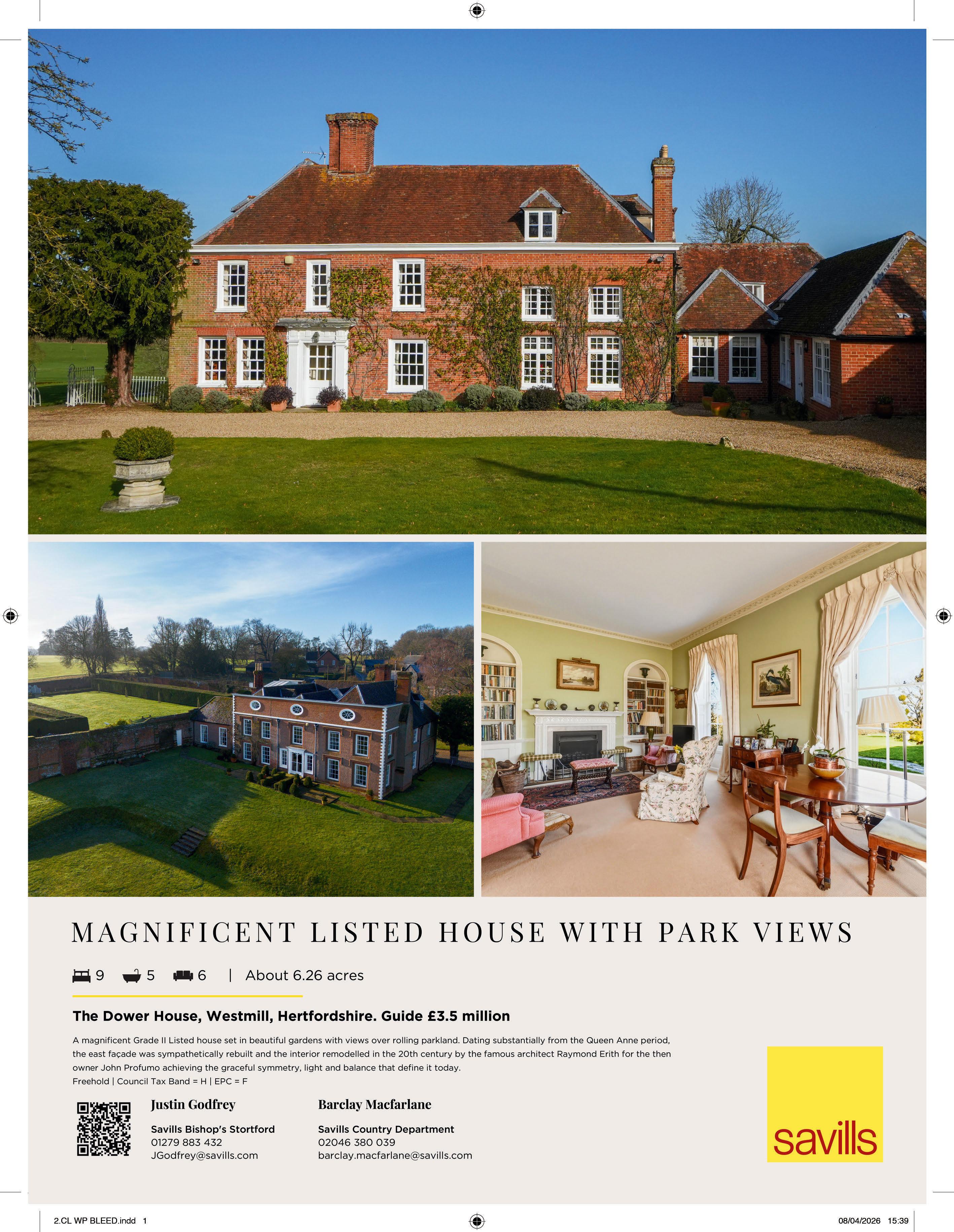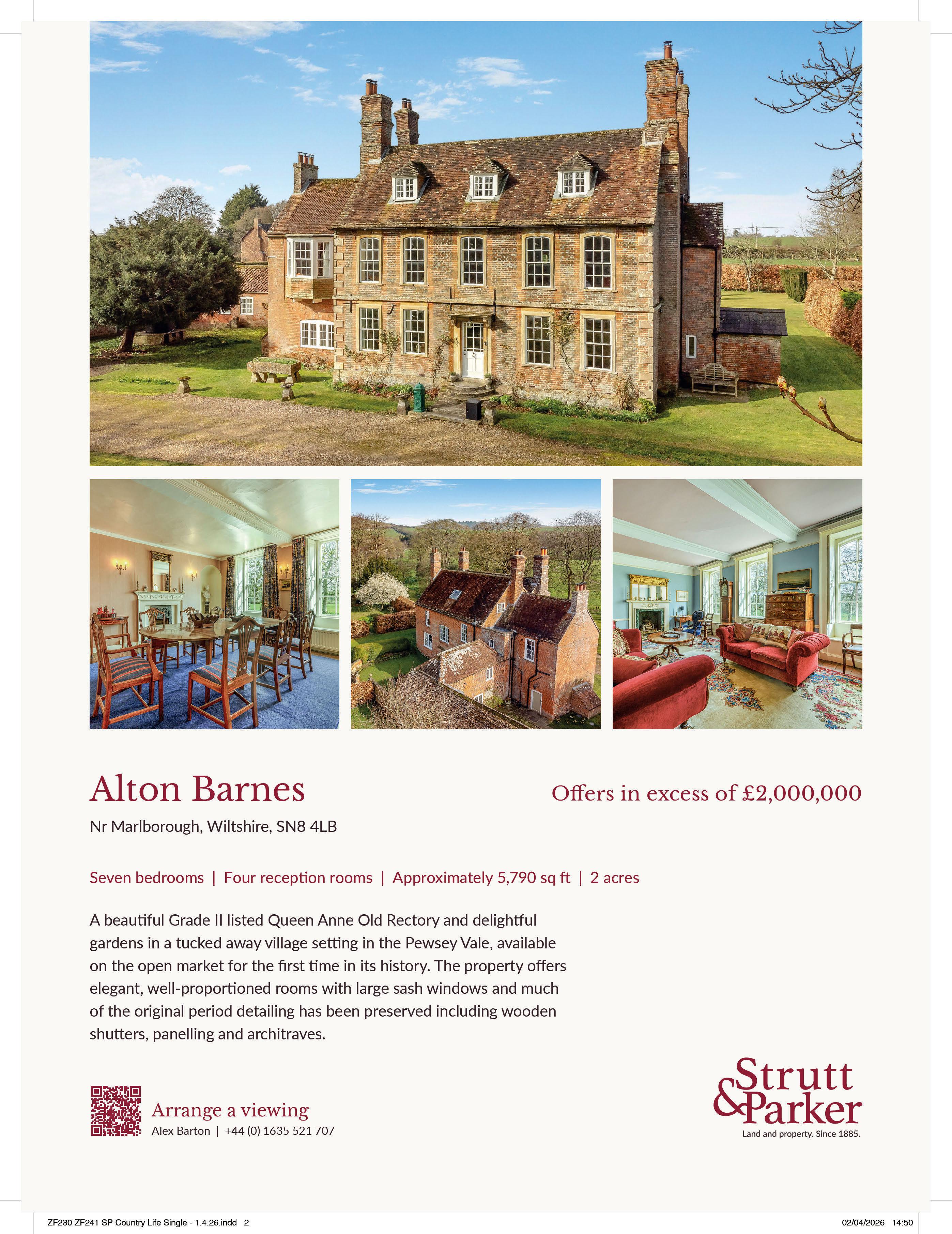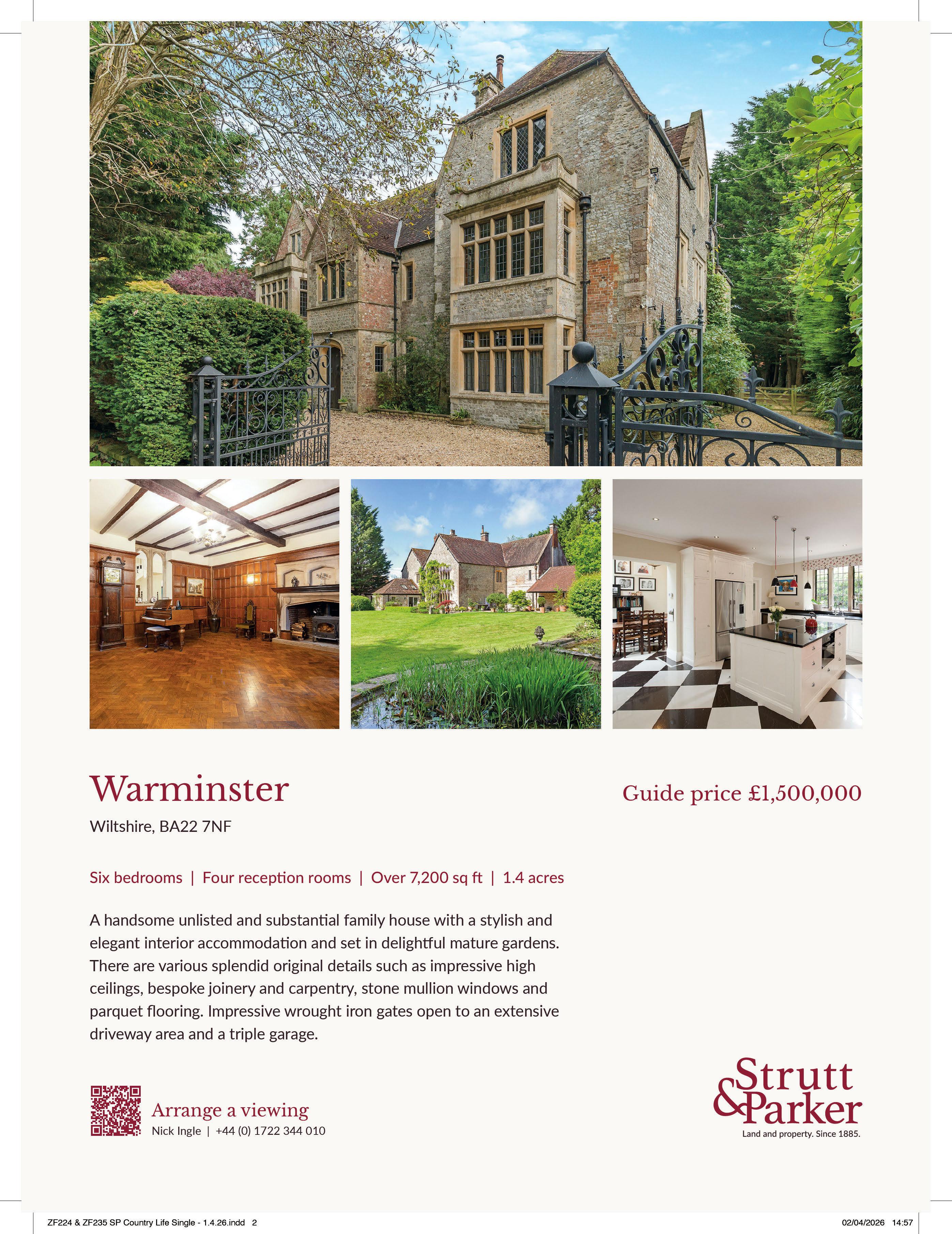 Grade II-listed Moreton House, in the village of Moreton Morrell (with views over countryside to the back), was built in the 18th century and altered in the 20th. Its limestone frontage earns plaudits and a brick wing adds interest. Inside, period features, including open fireplaces, proliferate. Connoisseurs of wine will be able to store it in the cellar and will be spoilt for choice for rooms in which to enjoy their Chablis or Pinot Noir, thanks to formal reception rooms with grand proportions, as well as smaller and cosier spaces. The seven bedrooms are spread over two floors, three of them particularly characterful, being in the eaves. Outside, wrought-iron gates with brick pillars signal to visitors that they have arrived, passing sweeping lawns and formal gardens with ornate box and yew hedging before heading inside. For fans of the Bard, Stratford-upon-Avon is only 8½ miles away. Butler Sherborn (01451 830731)