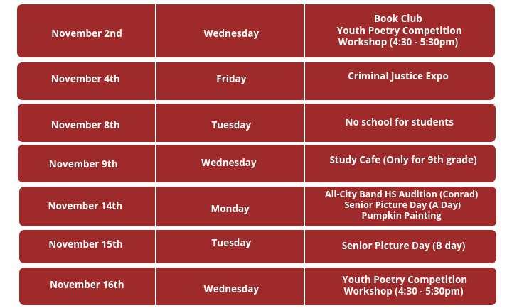 November 1st: Grant Halliburton presentation for parents: 6:30 pm in the library “SAFE!" Issues Affecting Today’s Youth and How You Can Help.