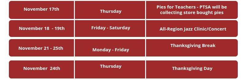 November 16th: Pies for Teachers - We will be collecting store bought pies to send home with our teachers for the Thanksgiving Break. You can sign up on our signup genius.