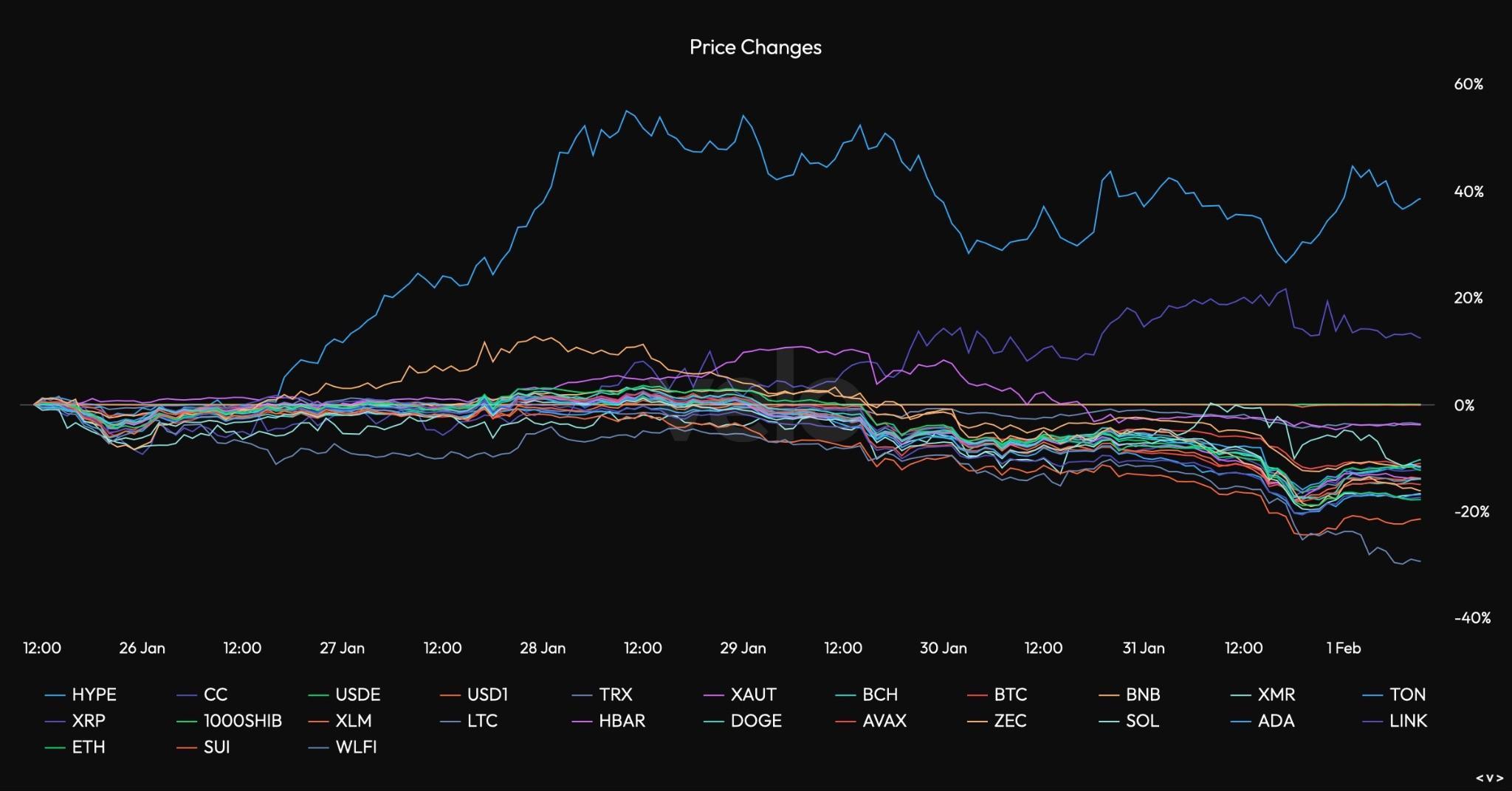 主要 Altcoins 跟隨 BTC 下跌,但跌幅在不同資產間出現明顯差異。Ethereum 單日下跌 17.33%,至約 2,243 美元,並自 8 月 4,958 美元高點回落約 54%;XRP 下跌 14.25% 至約 1.5 美元;Solana 則重挫 18.89% 至約 96.5 美元,為 300 天以來首次跌破 100 美 元。相較於週初,賣壓明顯加 。唯一週線仍為正報酬的主要 Altcoin 為 Hype,上漲約 44%。