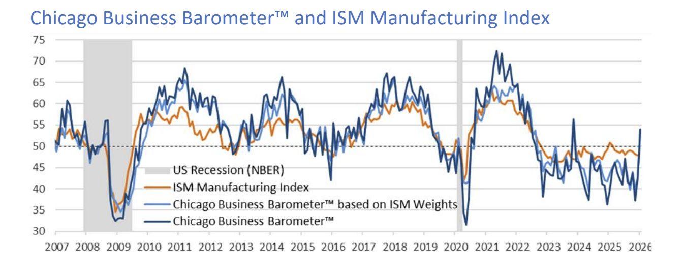 芝加哥 PMI 因發布時間較早,且走勢通常與全國性的 ISM 製 業指數高度相關,因此備 受市場關注。儘管此次反彈顯示製 業正趨於穩定,但指數水準仍低於過往經濟擴張初期 常見的水平,顯示當前更像是自低基期回穩,而非進入強勁成長階段。